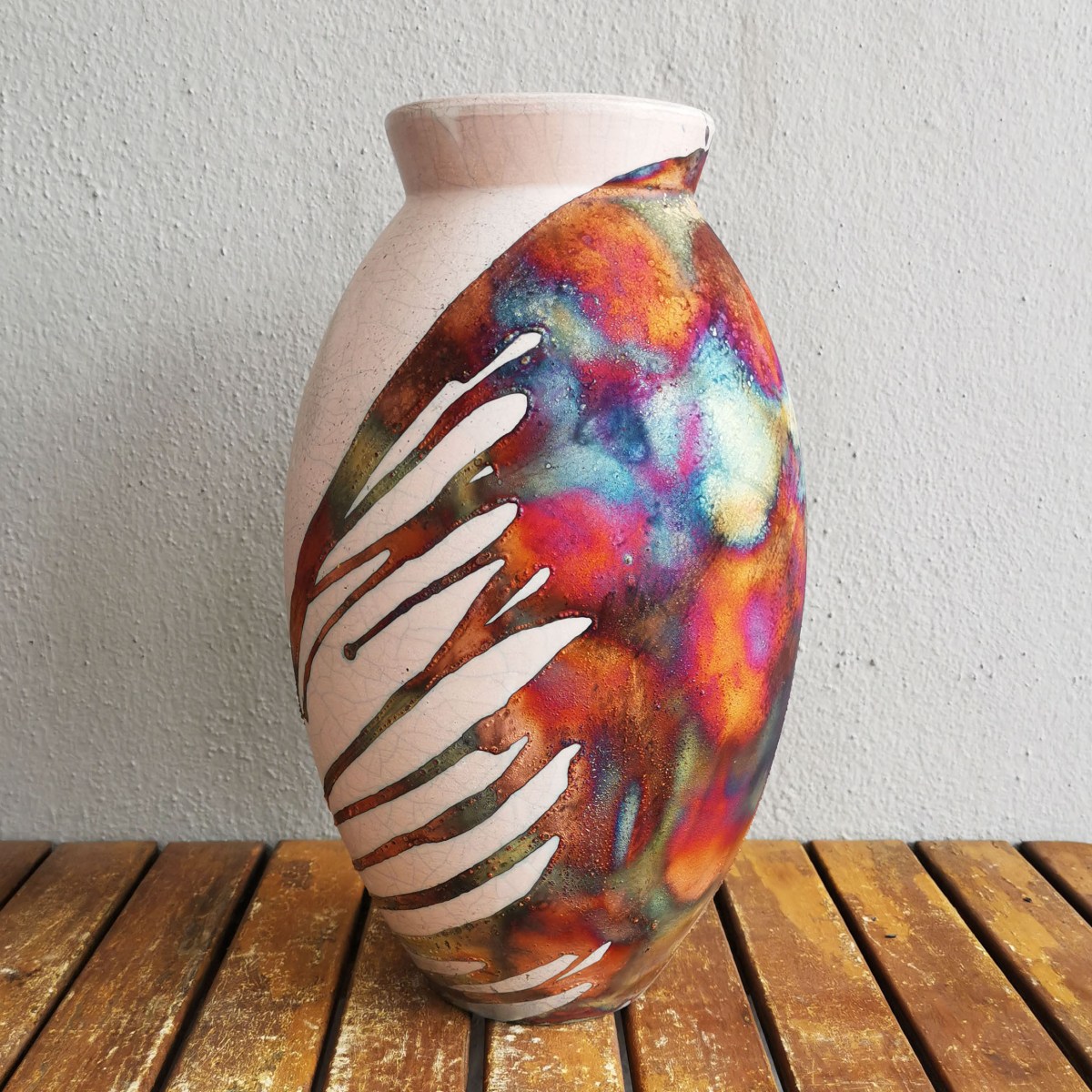 Raku ceramics are special because of the unpredictability of the raku firing technique. Raku firing is done in an extremely hot kiln and then removed while the ceramic piece is still red-hot or molten. Immediately after coming out of the kiln, the ceramic piece is then placed in a reduction chamber – usually a simple metal bin or container – filled with sawdust or paper. The extreme heat from the ceramic piece then ignites the combustible material in the reduction chamber, which is then sealed for a while. What happens inside the reduction chamber next is the key to the unique and unpredictable colors and patterns of each raku ceramic piece.