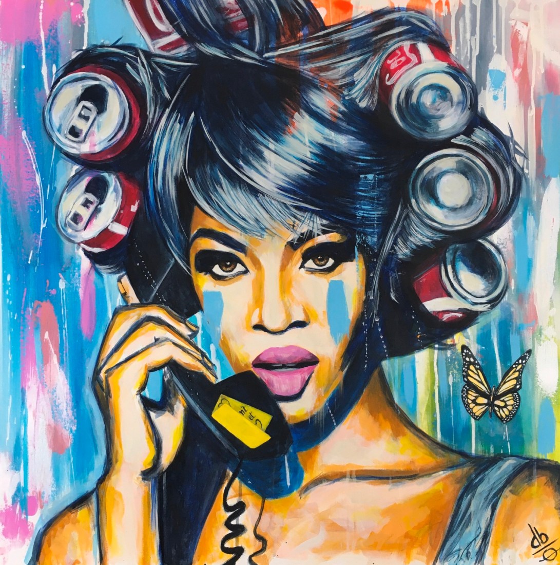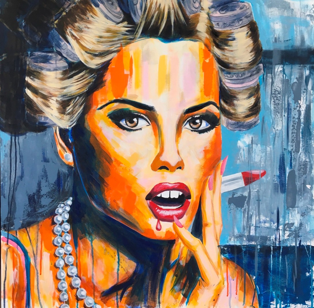 POP GIRL 8 Money curlers!!, acrylics on canvas, 80×80 (2021)
