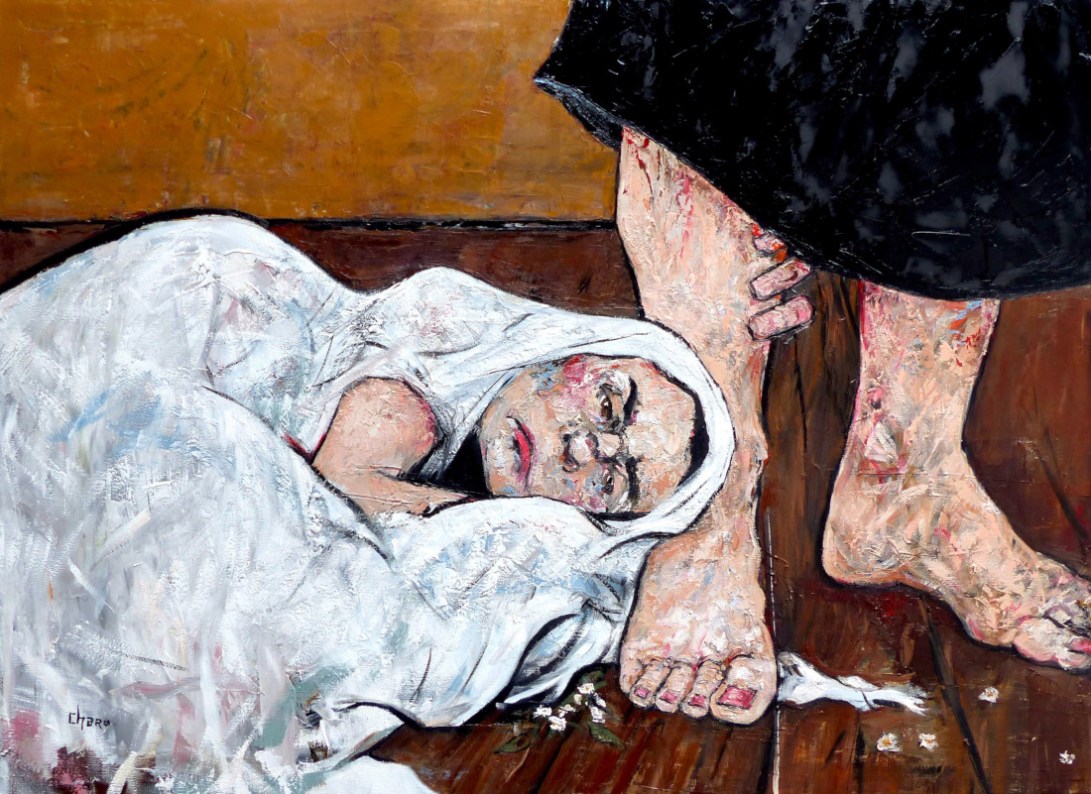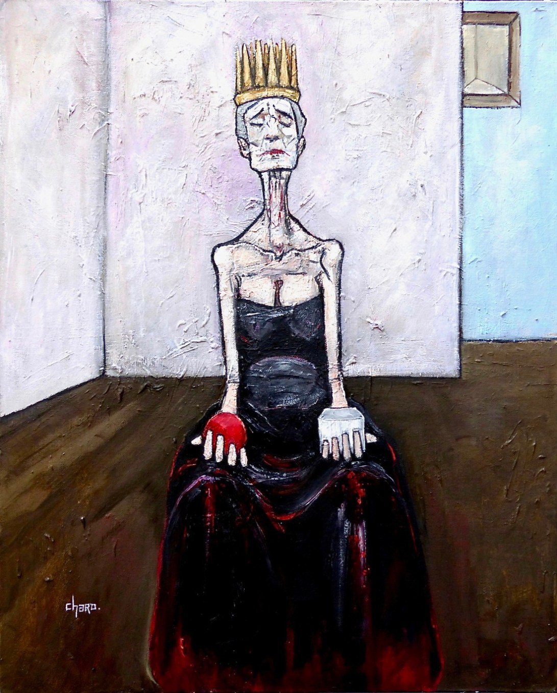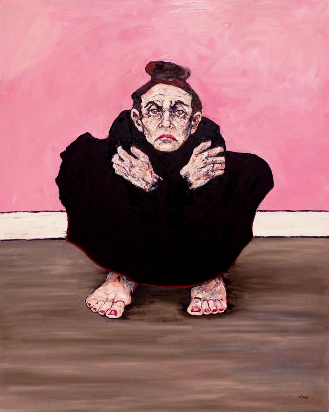 She works with oil paints and painting knives, to create thick textures. The artist exaggerates lines, accentuates poses, caricatures expressions, sometimes to the point of grotesque.