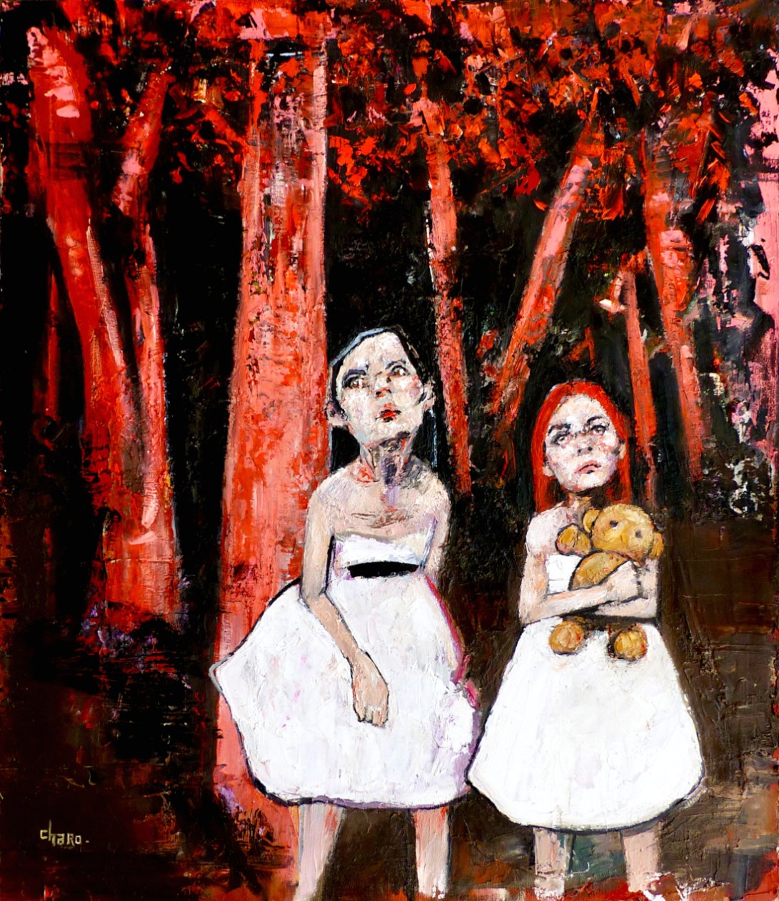In her paintings, she depicts worried groups of characters, often female. Fragile subjects, precariously balanced in a world full of uncertainties.