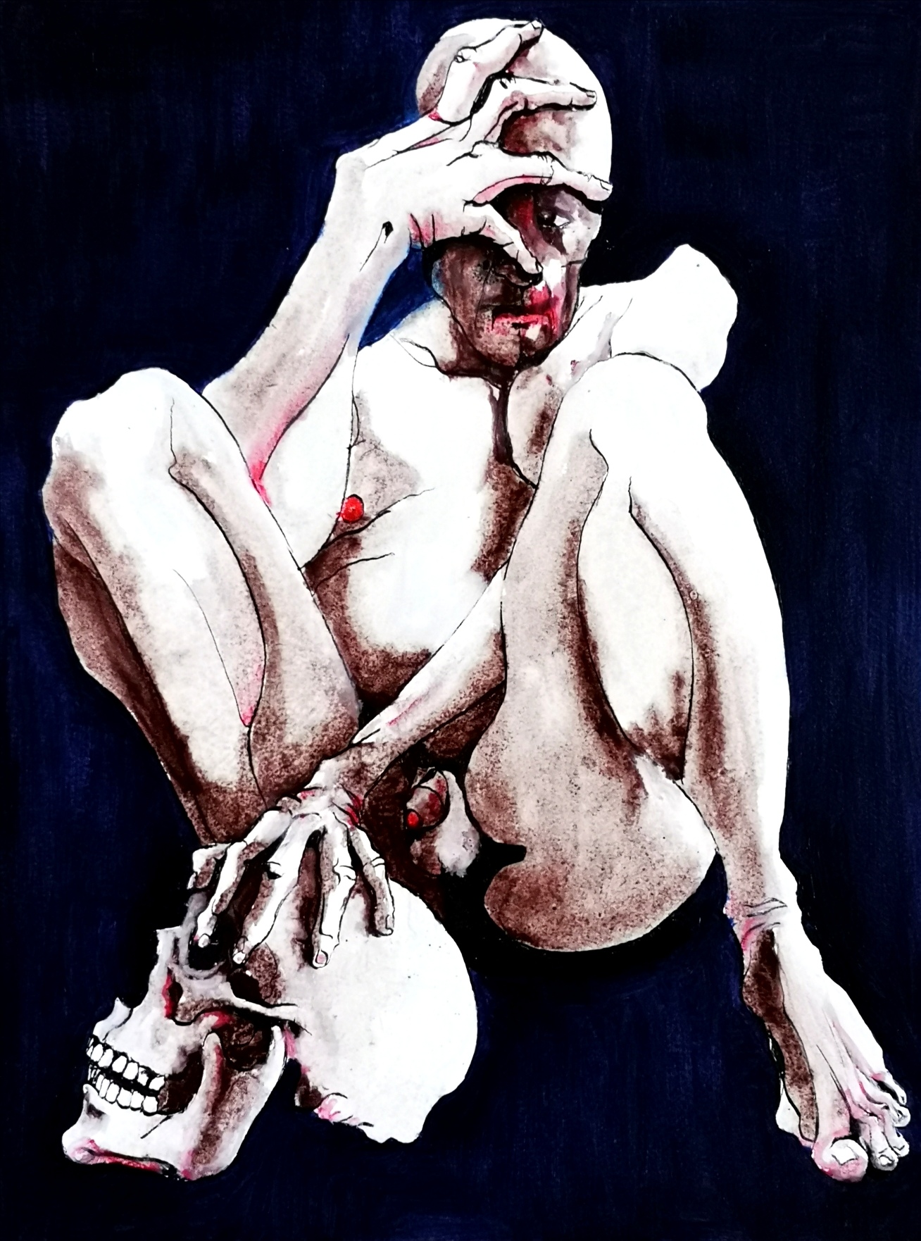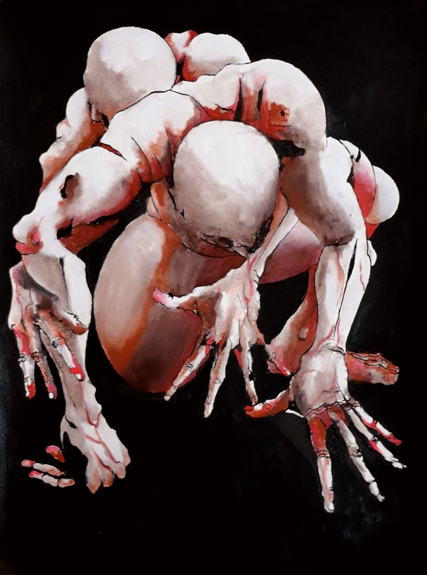 The drawing draws its inspiration from expressionism and the great classics, from their excessiveness. Excess in the way of upsetting natural forms, of limiting colors to shades of red, ochre, black and white, of disfiguring faces in a kind of painful delirium, abolishes all rules, substitutes hallucination for sensitive perception. The instinctive revolt of the body to the ordering reason.