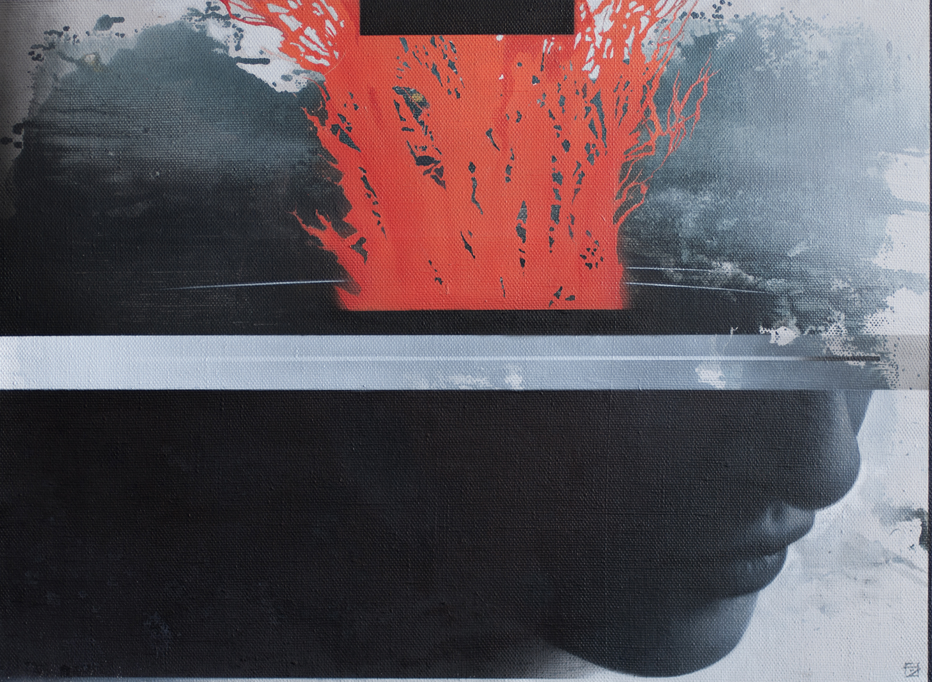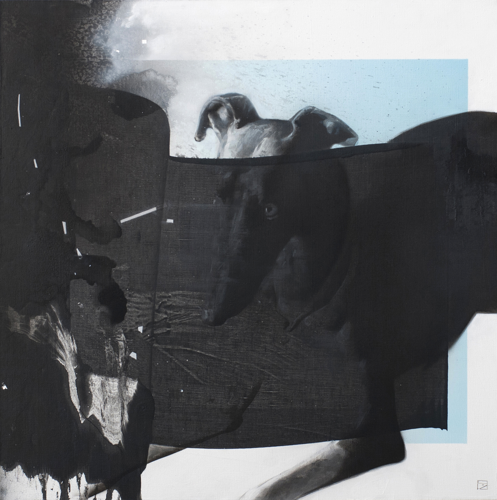 Presented paintings originate from the latest series of my works where I continue to address concepts of object perception, archetype reproducing in cognition and “the observer effect”. The focal element of these paintings is human’s face diffusing into abstract geometrical forms. Face as a concept is to be interpreted as a symbol of cognition and “the observer” mentioned above. What I mean here is the process of self-identification doesn’t work through looking at oneself in the mirror. It works through perception of non-self which is from “observer effect” standpoint should be differentiated from self. And this image of non-self being reproduced multiple times through different angles and perspectives repeats itself but at the same time changes. This duality allows the image to be recognized fuller and creates some sort of memory dimension. Deepening those dimensions through perspective gives one an opportunity to learn so much more about the actual observer state. Previously I used to study those phenomena by working with Rorschach approach – using abstract forms to crystallize images lying within my own consciousness. I challenged the paradigm of interpretation relying solely on this pre-existing database. I was interested to achieve an entity that wasn’t yet present in my mind. To reflect this adjustment concept, I now use cleaner and clearer forms which you can see on my paintings. But still they carry remnants of abstract noise of cataloguing/not-cataloguing process. So – final image morphs into something different but inheriting properties of the initial object.
