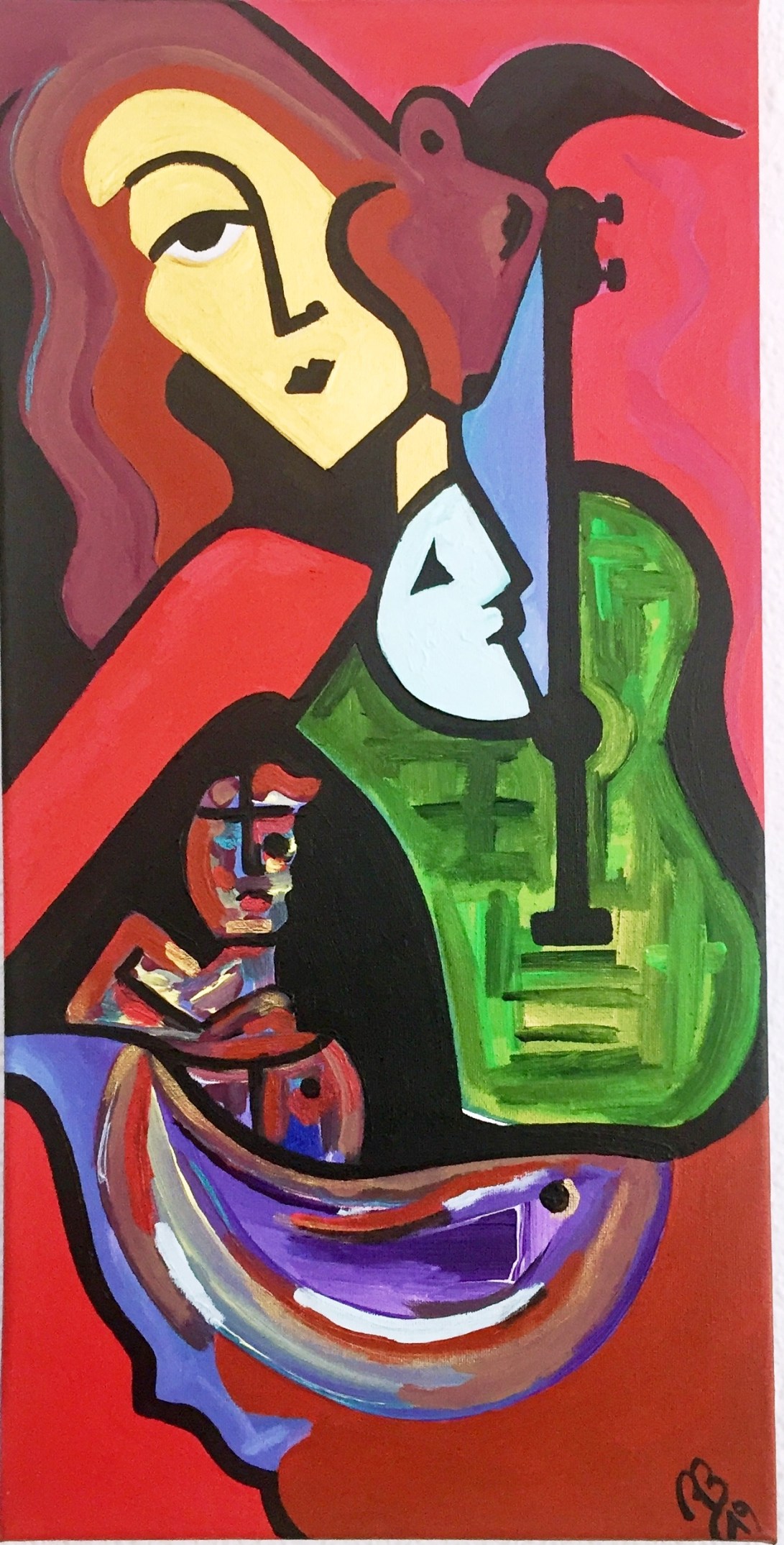 Francisco’s style is surreal-expressionism, although he does not limit his work or perspective to just one style or approach. He bases most of his paintings on musical themes and uses instruments as well as bodies to represent players and dancers which exist in the world of jazz and fantasy he is creating. He uses colours boldly to express feelings and emotions, and many times he paints an abstract background to his mostly figurative paintings. However, being that he believes that art is the “search” he continuously experiments and investigates new and different approaches to create paintings that truly communicate and transmit the message that he wishes to share.
