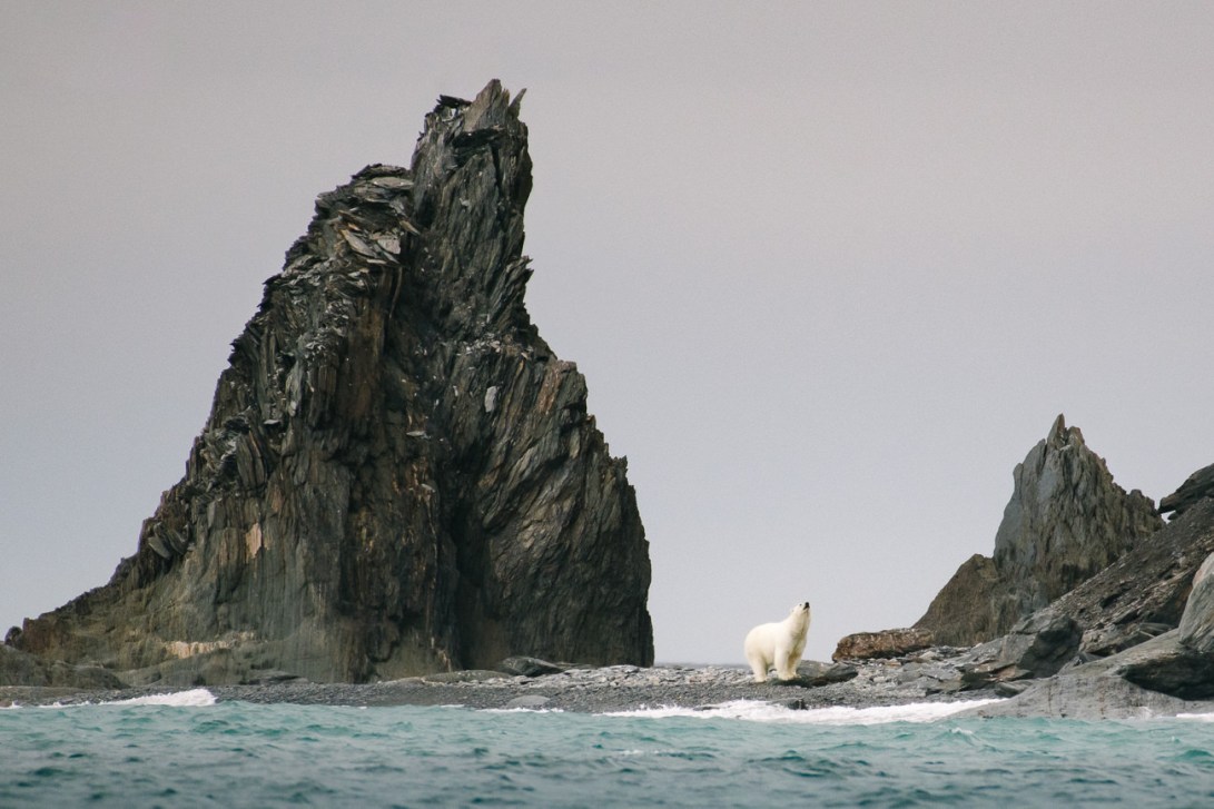 A polar bear waits by on a beach near sea stacks on Russia’s Herald Island in August, for the return of the sea ice. The retreat of the summer ice in the western Chukchi Sea has concentrated hundreds of polar bears on this island and nearby Wrangell, so personal space for these non-social bears is limited.