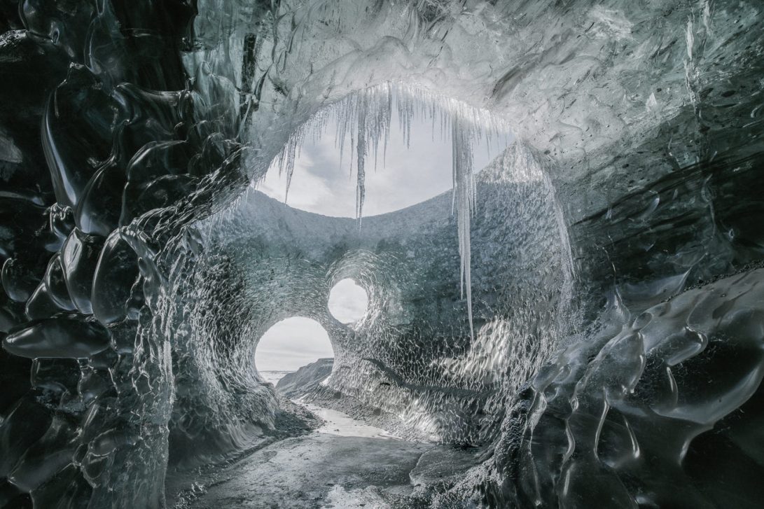This wonderland of ice is an ice cave which recedes hundreds of meters into the Breidamerkurjokull glacier in Iceland. Ice caves like this are the runoff route for meltwater further up the glacier.