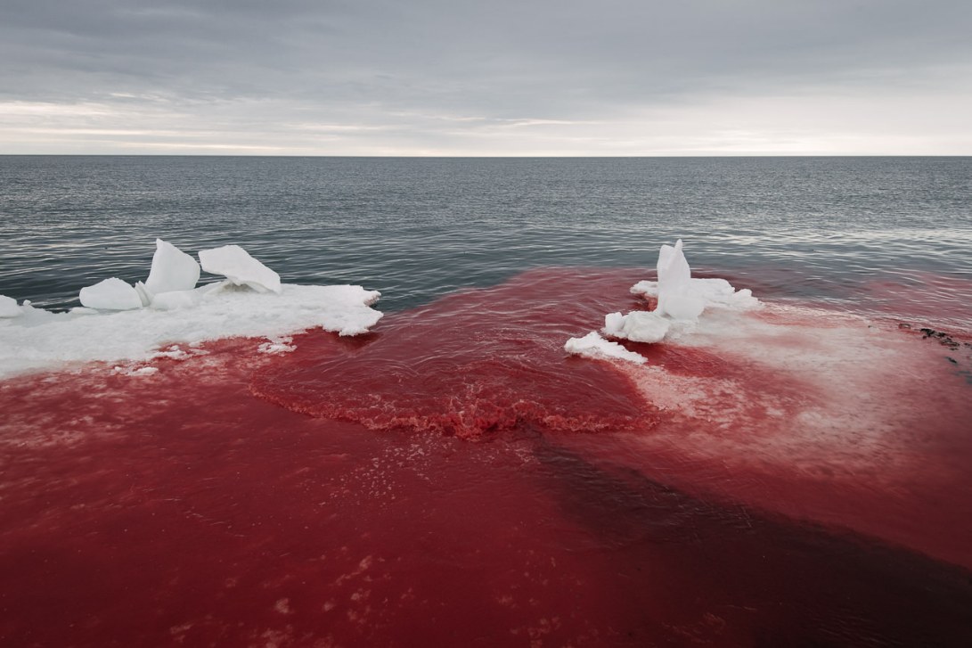 A wave of blood from a recently harvested bowhead whale washes onto the sea ice north of Nuvuk, or Point Barrow, Alaska in late spring. For Westerners, the perception of traditional subsistence whaling is often negative; for hunter-gatherer peoples like the Alaskan Iñupiat, it is seen as a joyful and indelible part of their culture that brings everyone together.