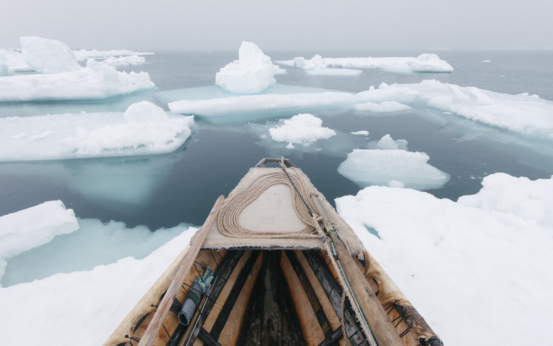 Traditional whaling is practiced in tune with the unpredictable weather of the Arctic. Wind has pushed floating ice near the shorefast ice and the whalers must wait until it shifts again, sometimes weeks later.