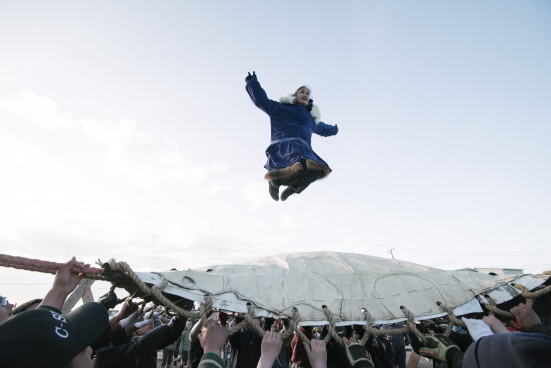 At Nalukataq in Utqiagvik, Alaska, the Iñupiaq whaling festival, the village comes out to celebrate a successful whaling season and to give thanks to the whale for its gift. Phoebe Kippi flies through the air during the blanket toss. She and other successful whalers are thrown up to thirty feet, and depend on everyone’s hands to land safely. This trust goes back millennia, and ensures intimacy among the Iñupiaq community.