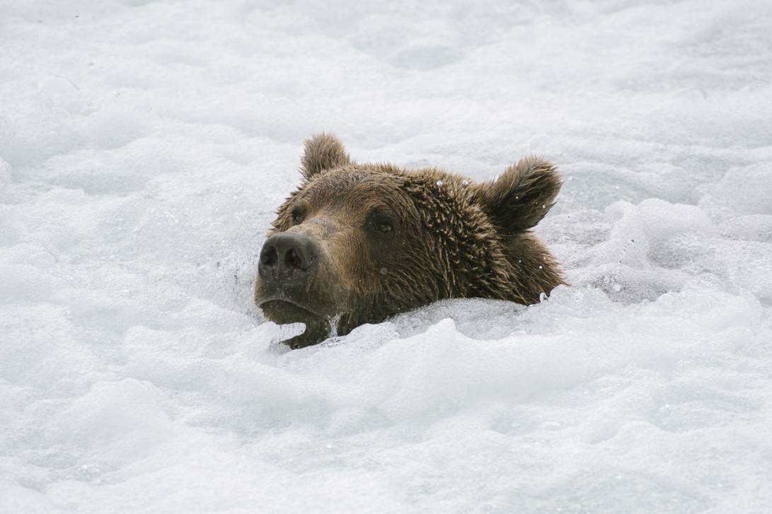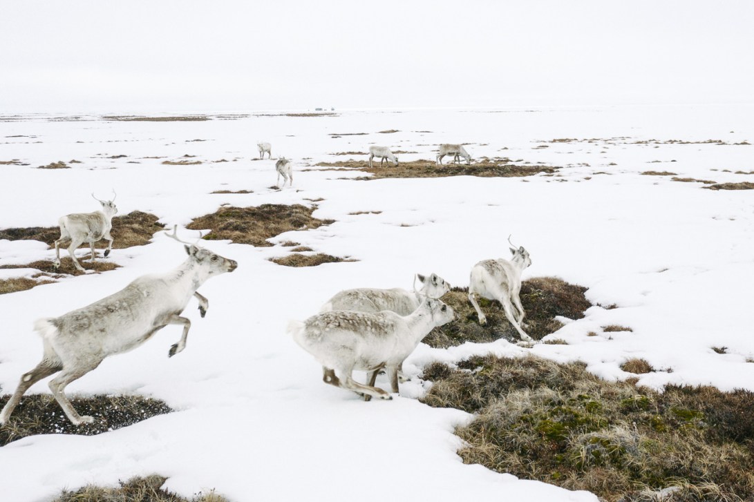 Caribou from the 50,000-strong Teshekpuk herd jump through deep snow at the edges of Teshekpuk Lake in May. The herd is an important to Alaskan Iñupiaq subsistence hunters from the nearby villages of Utqiagvik and Nuiqsut. Says Iñupiaq hunter Jonah Nukapigaq, “Pretty much all of us depend on our caribou.”
