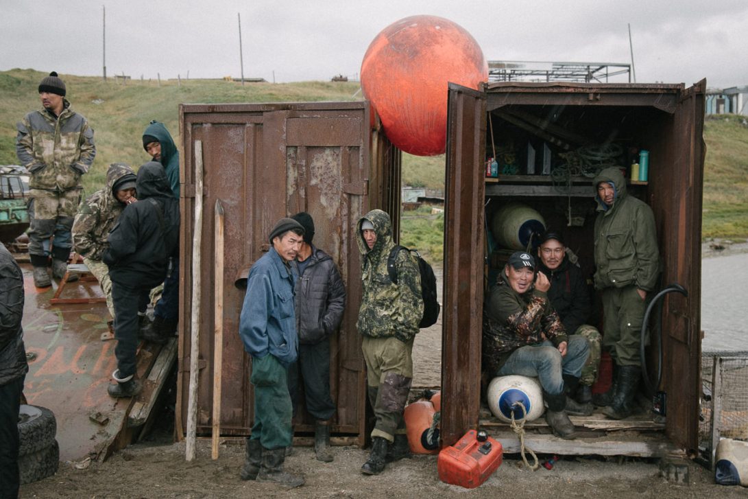 Indigenous hunters and fishermen from the village of Lorino, in Russia’s Chukotka province, gather to wait out the pouring rain and stormy weather of a summer’s day in the Arctic.
