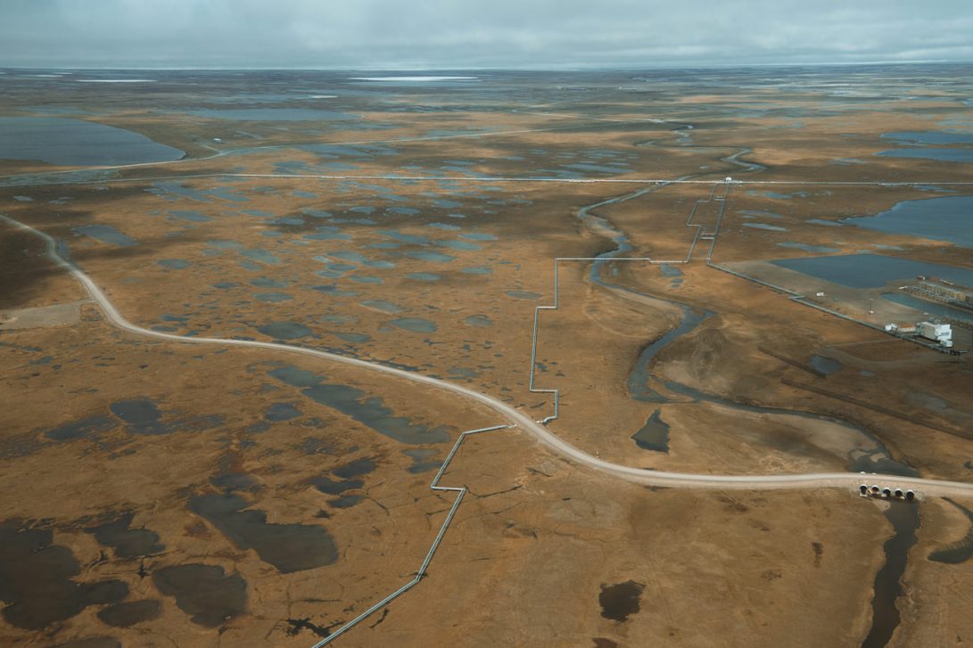 An access road outside of Prudhoe Bay, Alaska intersects a set of pipelines. Seemingly insignificant oil support infrastructure can alter the dynamic of the relatively flat and featureless tundra in surprising ways because of the sheer unbroken length of roads and pipelines.