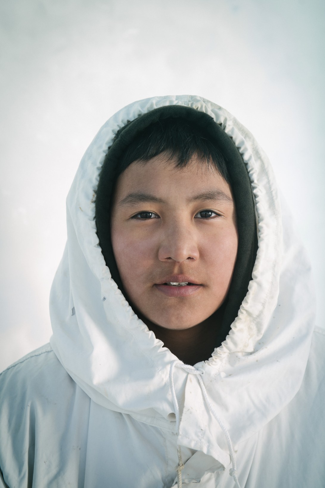 16-year old Yugu Ningeok, a member of an Iñupiaq whaling crew, wears his ice camouflage cover, or qatiginisi. Yugu is named after his uncle, the original founder of the whaling crew.