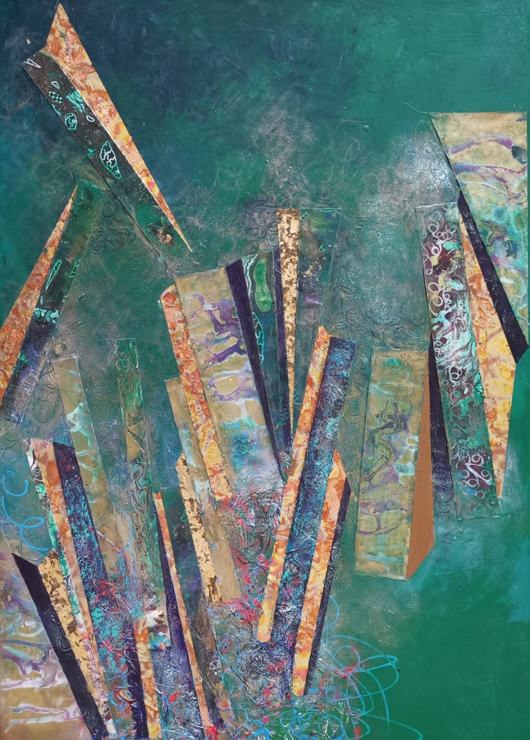 My pieces may be layered, worked and reworked again, so that an inner alchemical process runs through as a theme in all my works, whereby each piece is further altered and refined into something very different from what it may have been in the first place. These materials have sometimes included materials that might otherwise be perceived as rubbish – glass crystals from broken cars/buildings, gypsum, melted polystyrene and so on. More recently, material used include metal foil, geometrical shapes cut from older collages, clay in which patterns can be imprinted, and crack paint. The layers of my works often represent memories encoded in newer and older layers, adding more and more complexity to each surface. The layers are also intended to create the sense of age or erosion within my larger pieces.