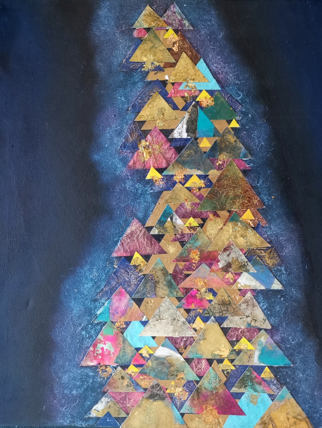 I especially prefer to work with translucent and reflective surfaces where the shimmer of gold, silver, copper or iridescent paints capture light, sometimes alongside glass and/or beads, infuse my works, being interactive with the environment and the interplay of light.