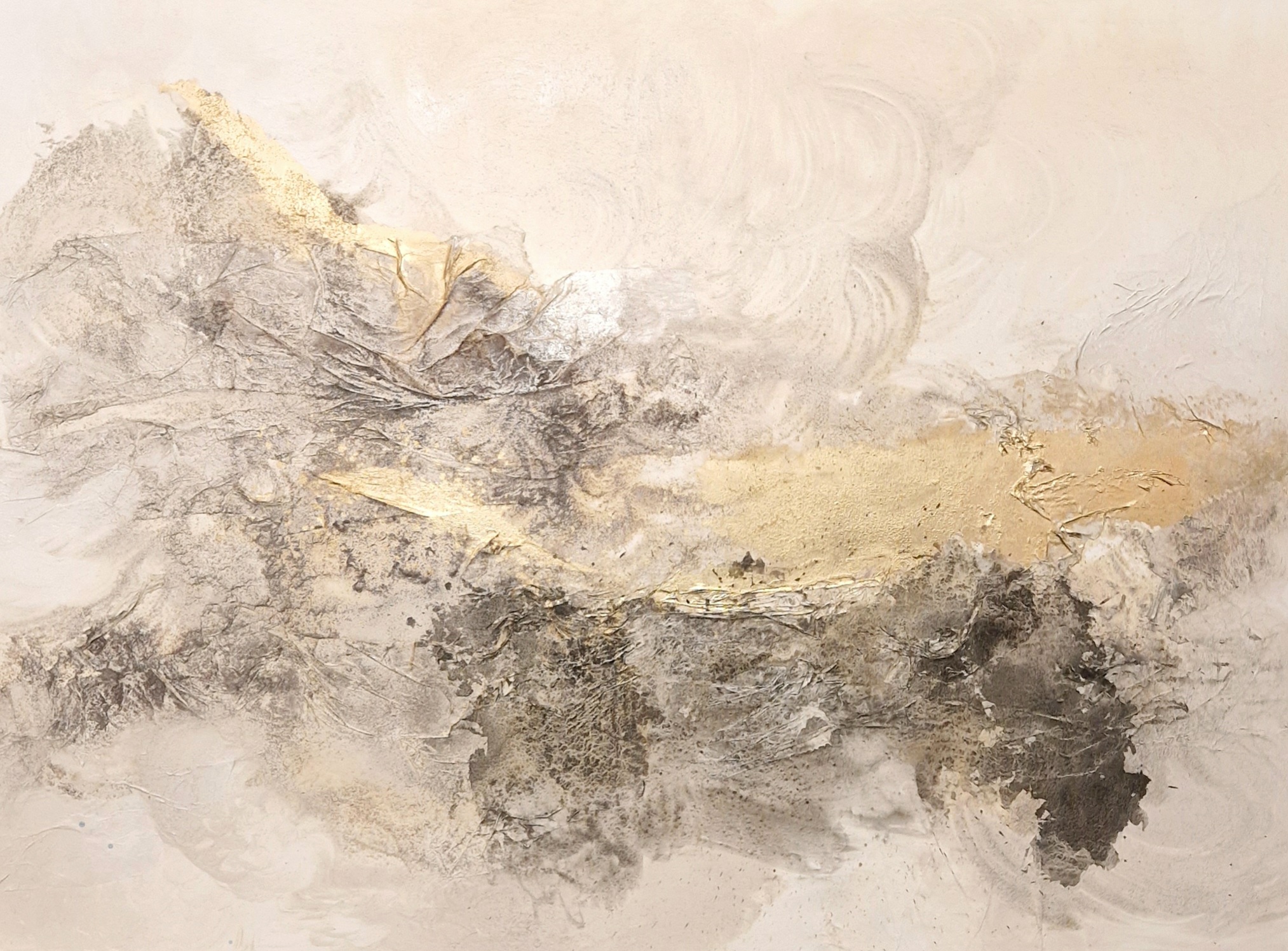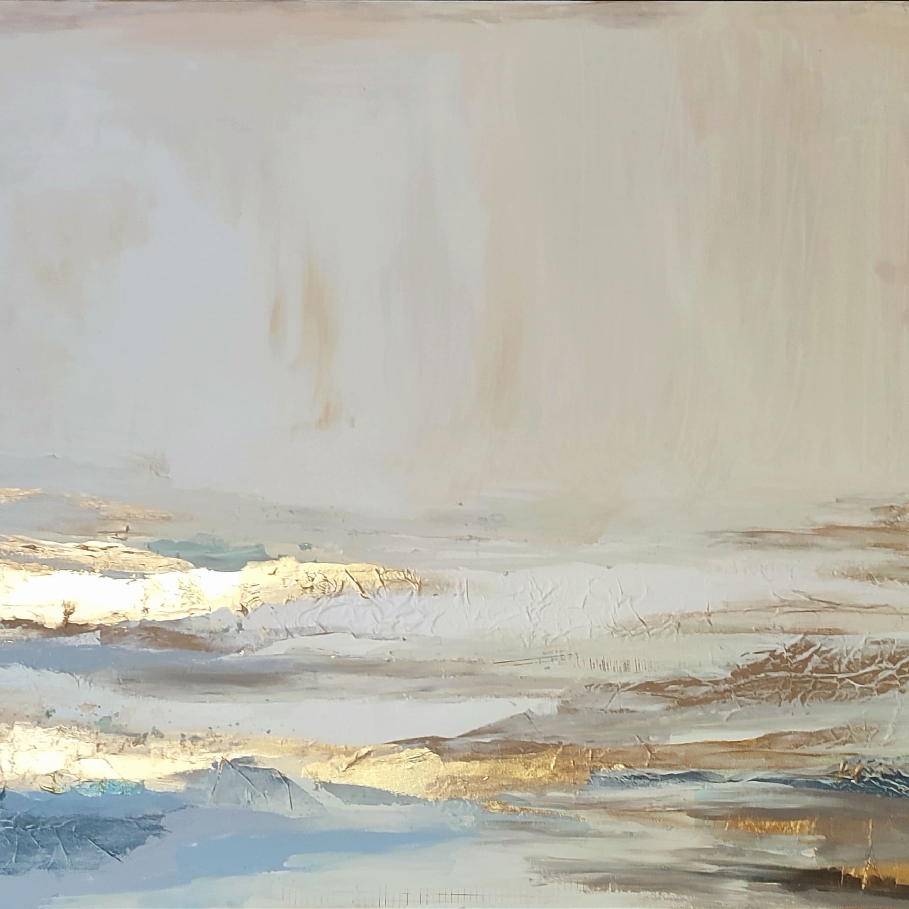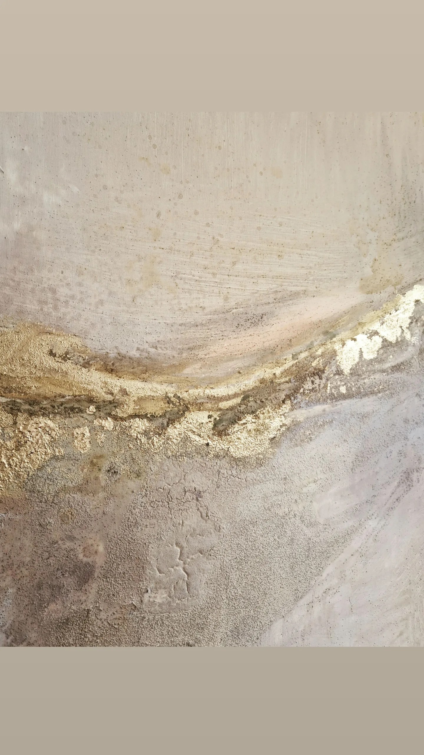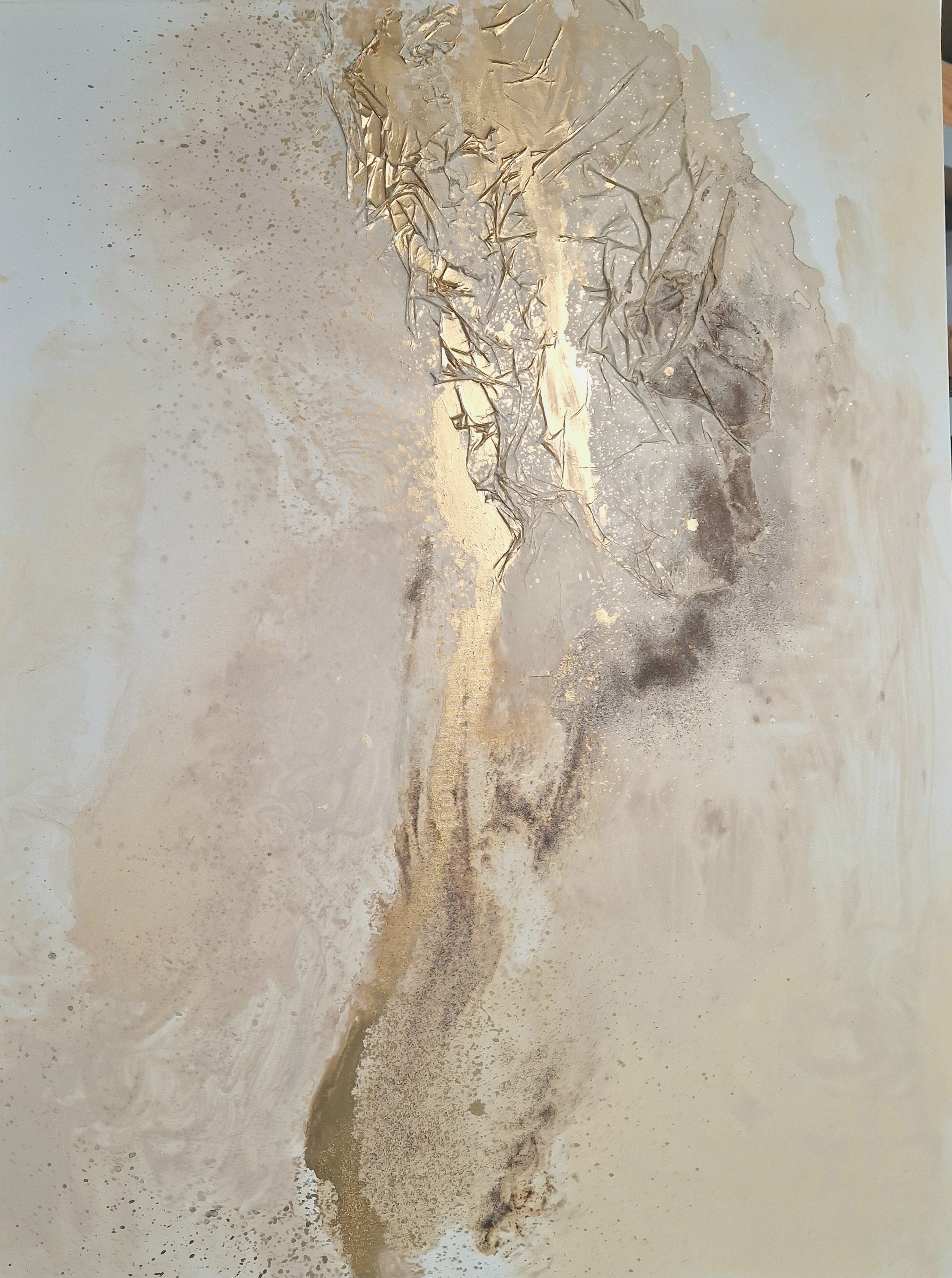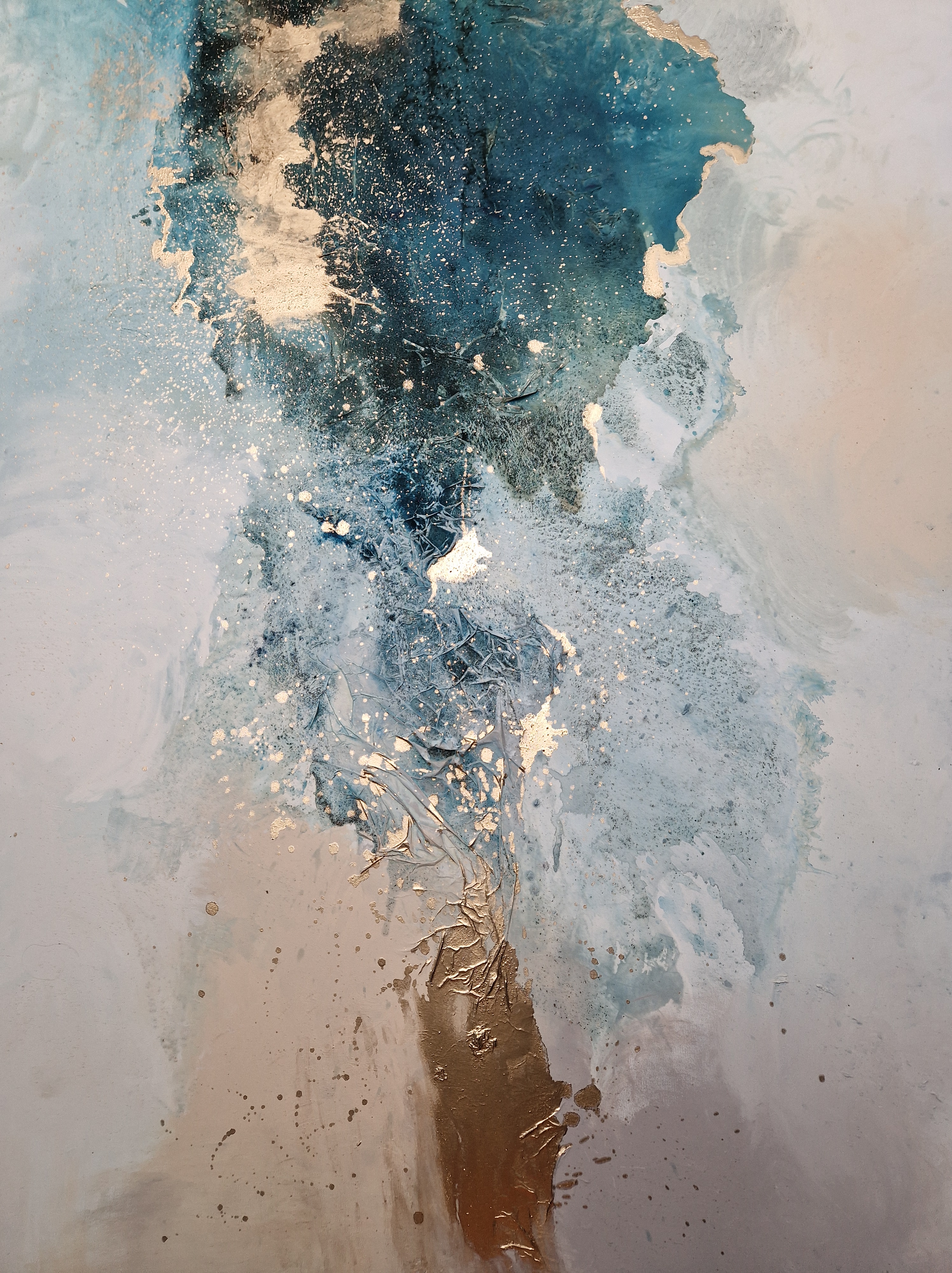 Magdalena Lenartowicz utilizes a full color palette inspired by the shades of nature. Her works feature azure blues, gentle pastels, sunny yellows, warm ochres, and sandy beiges – colors that evoke the elements of earth, water, and air. In addition to traditional painting materials such as richly applied acrylic paints, gold leaf shimmering among the folds of matter, and intentional cracks in the ground, Lenartowicz incorporates innovative solutions. She continually seeks creative exploration, experimenting with techniques beyond the typical artistic lexicon.