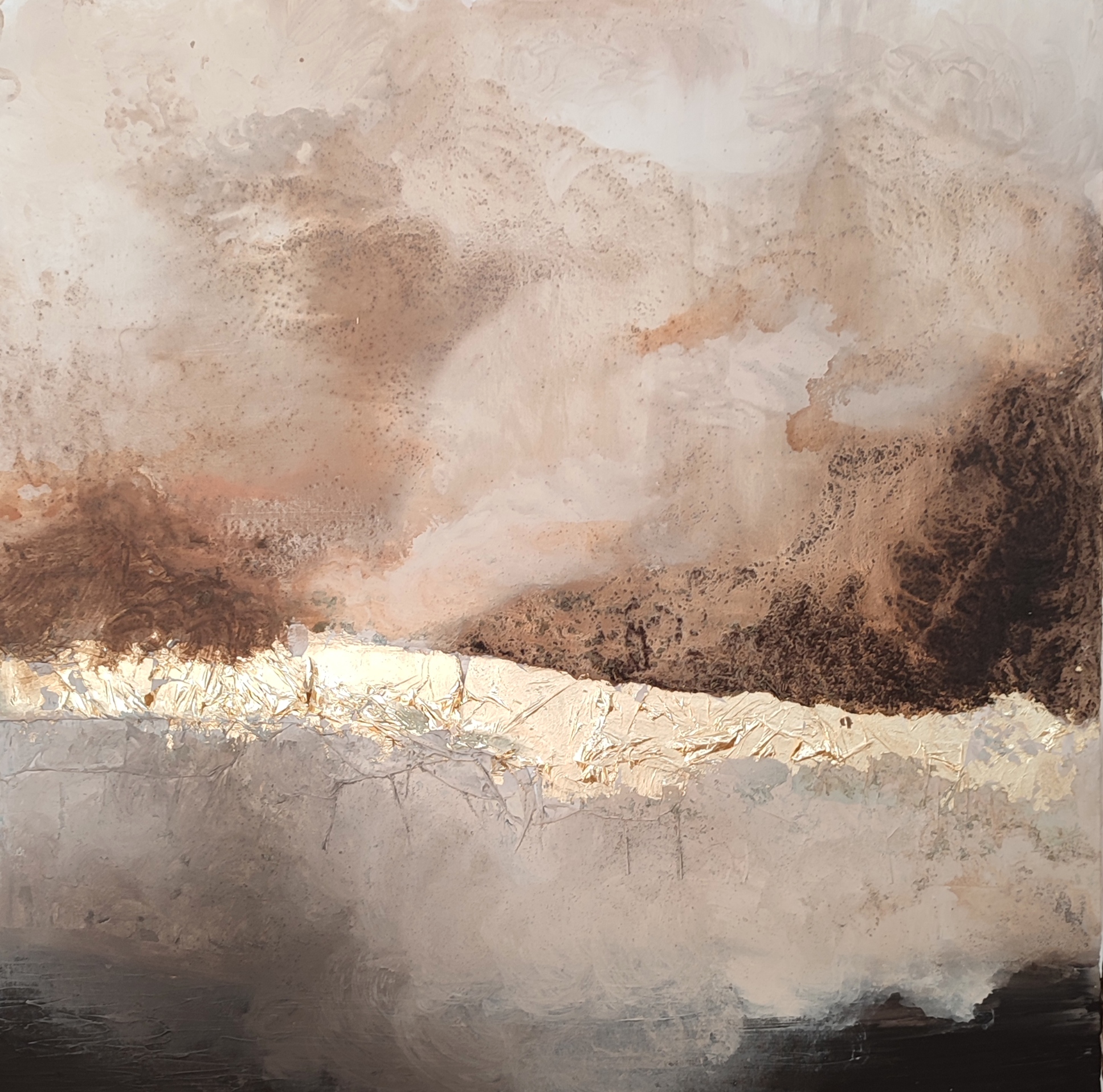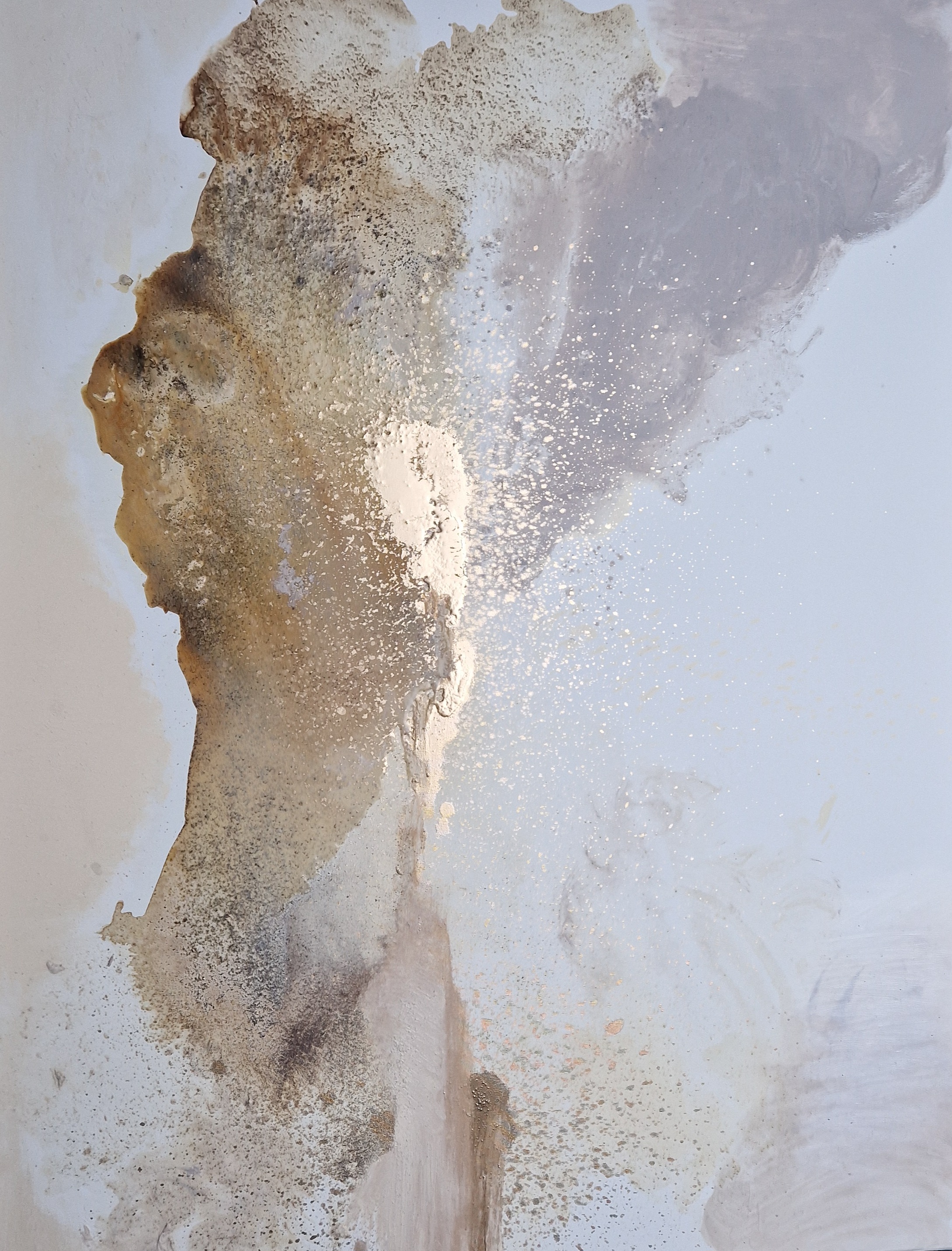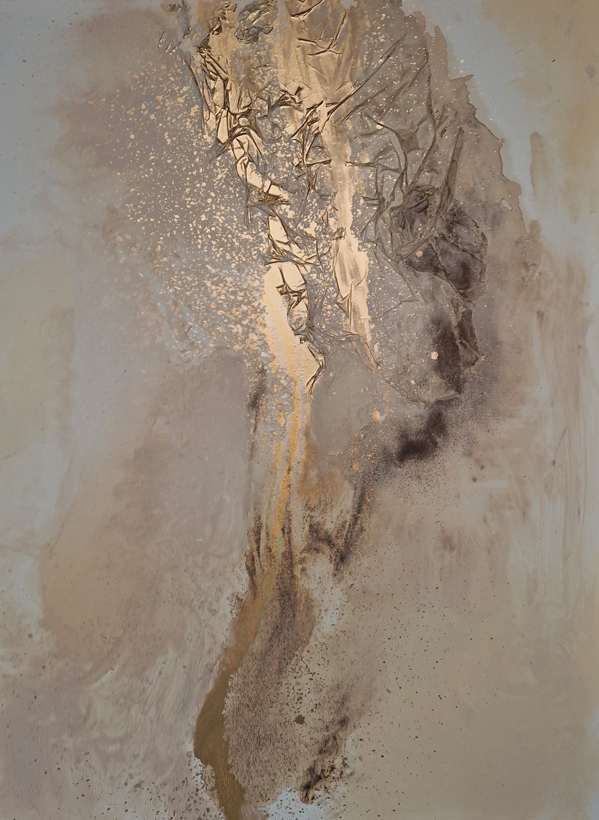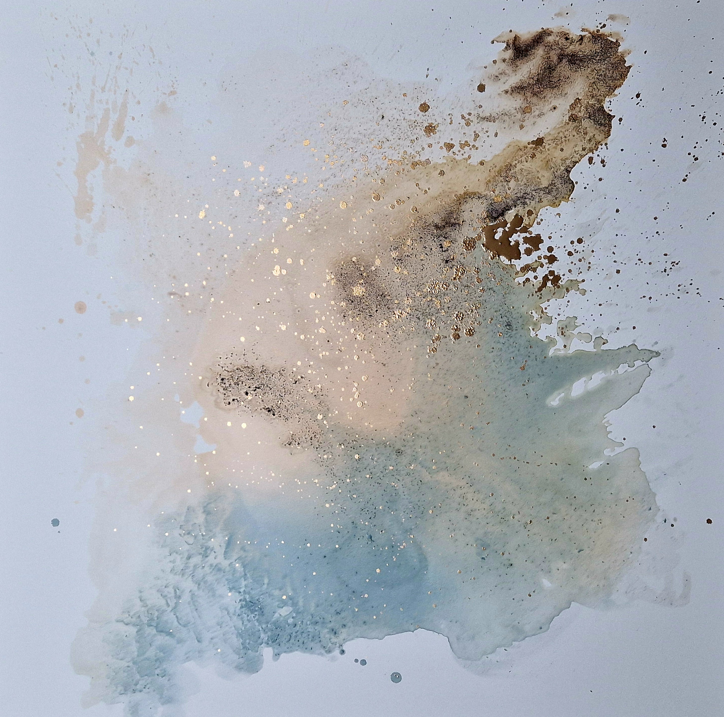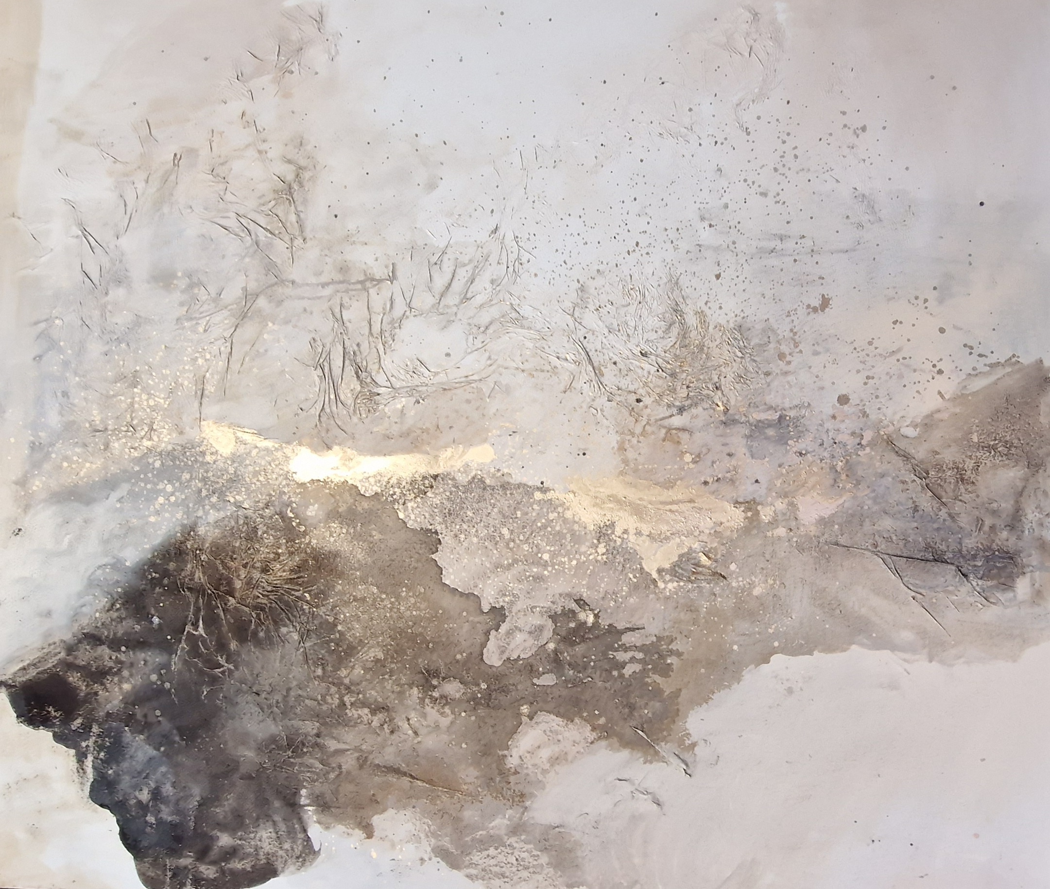 Magdalena Lenartowicz utilizes a full color palette inspired by the shades of nature. Her works feature azure blues, gentle pastels, sunny yellows, warm ochres, and sandy beiges – colors that evoke the elements of earth, water, and air. In addition to traditional painting materials such as richly applied acrylic paints, gold leaf shimmering among the folds of matter, and intentional cracks in the ground, Lenartowicz incorporates innovative solutions. She continually seeks creative exploration, experimenting with techniques beyond the typical artistic lexicon.