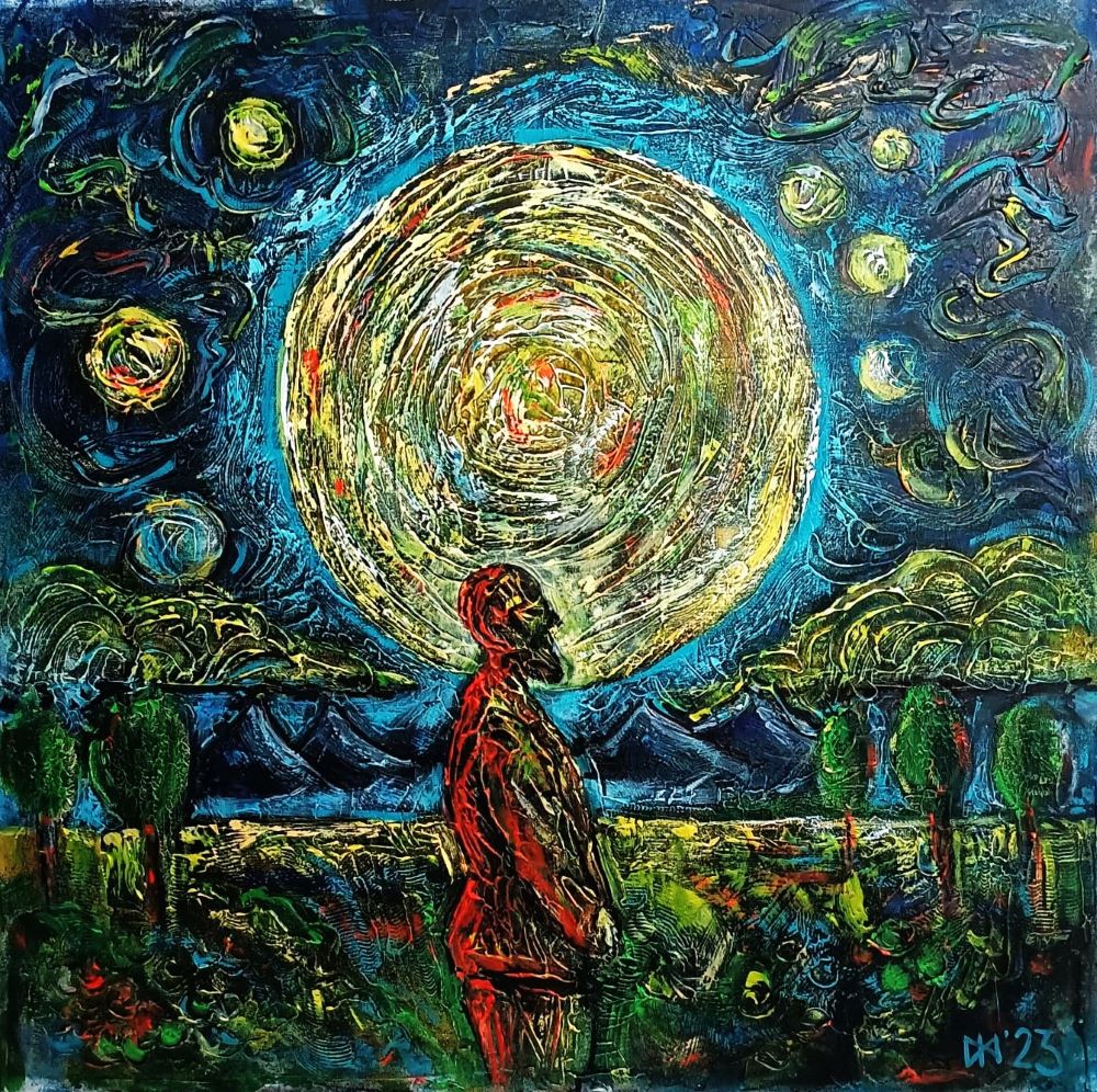 MAN AT THE CENTRE OF THE UNIVERSE, canvas, Acrylic, 90×90 cm