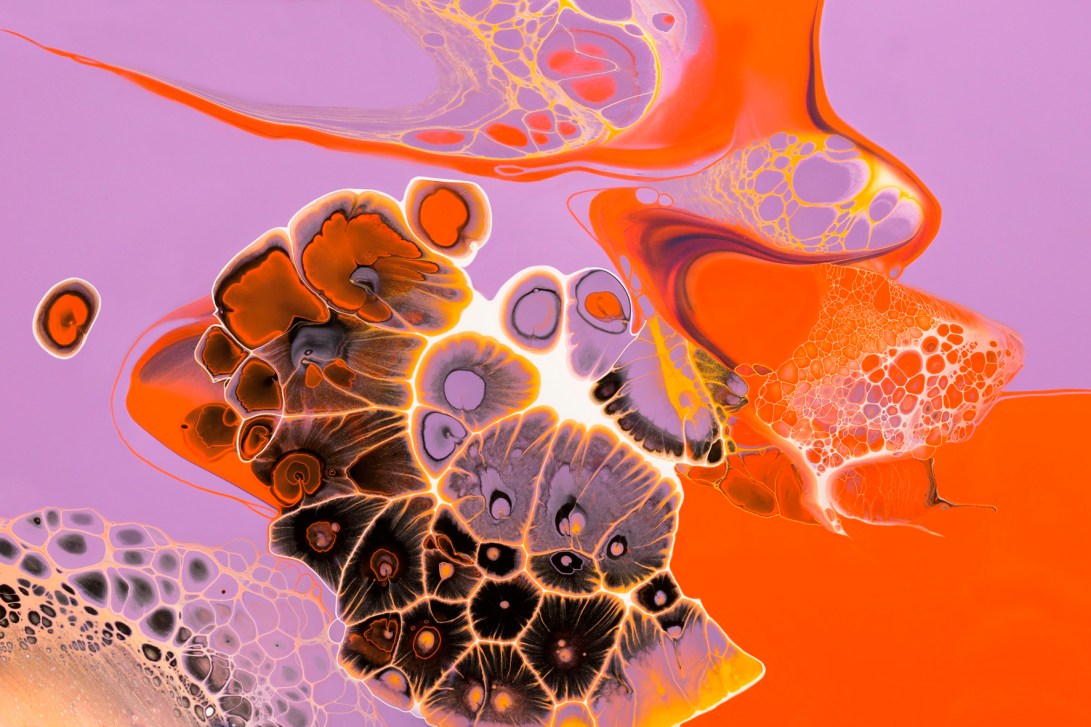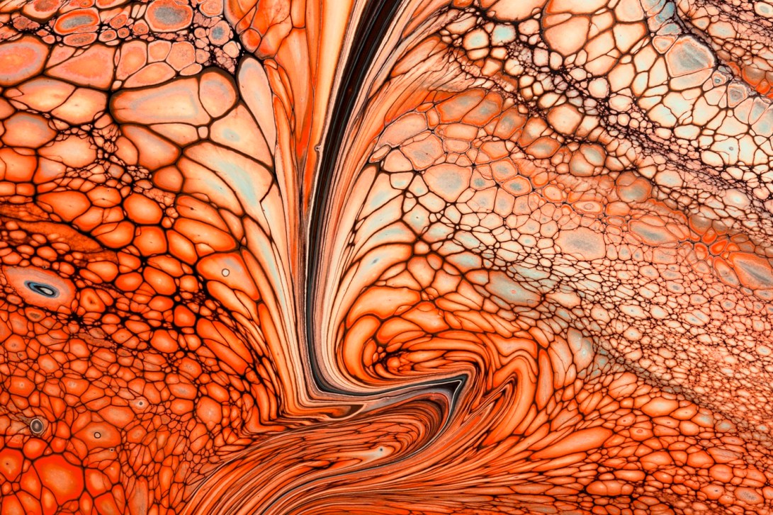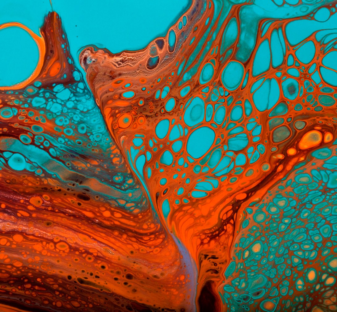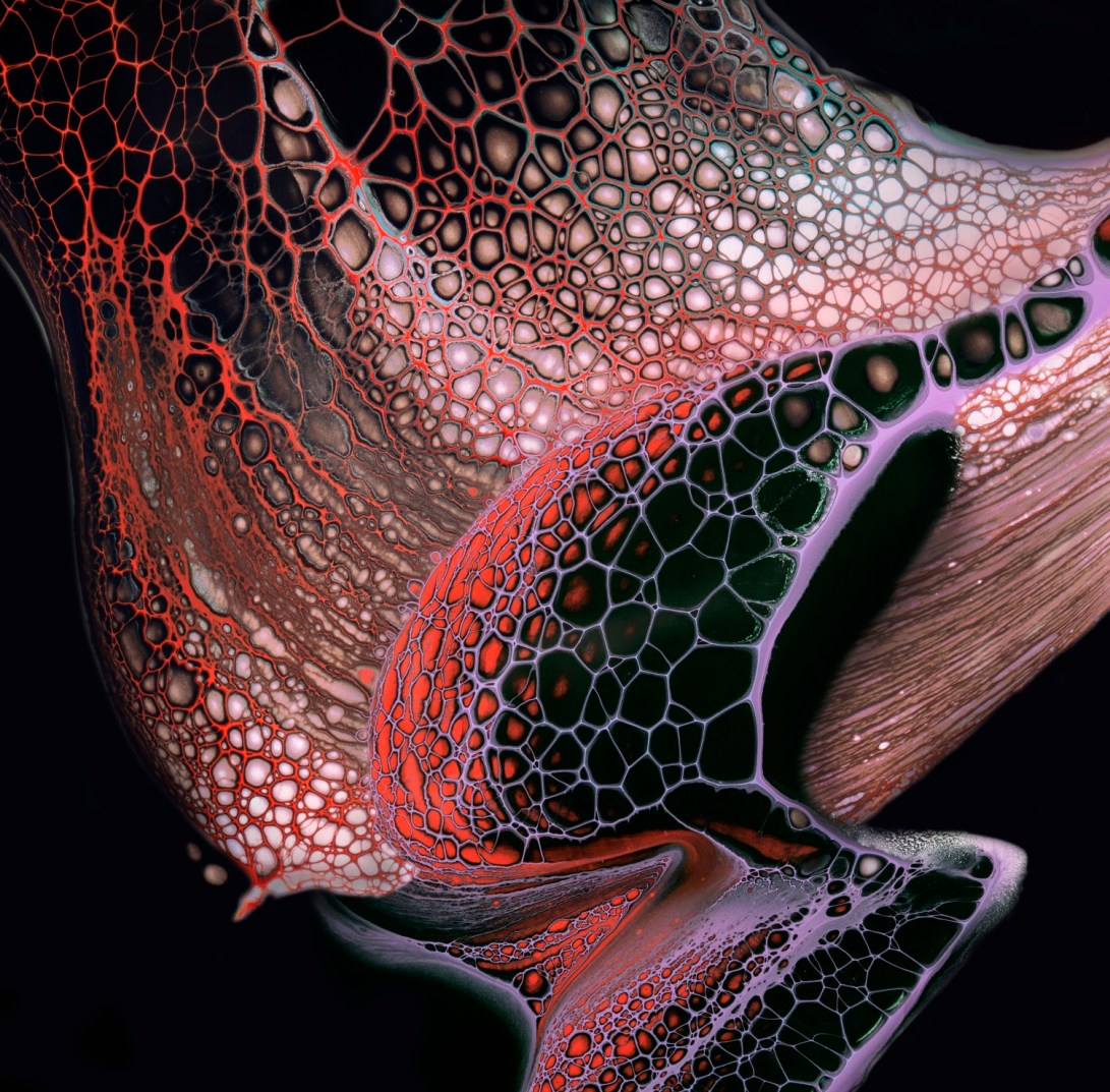 Inspiration comes from deep space photography; microscopic images of the natural world and from the paint itself whose naturally forming patterns inspire compositions as they evolve into unique paint effects.
