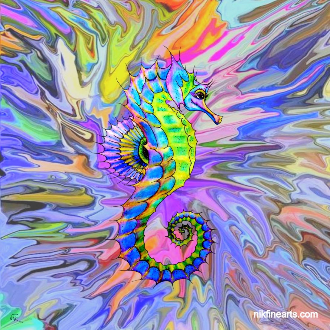 COLORFUL SEAHORSE, Acrylic on canvas, 32”x32”