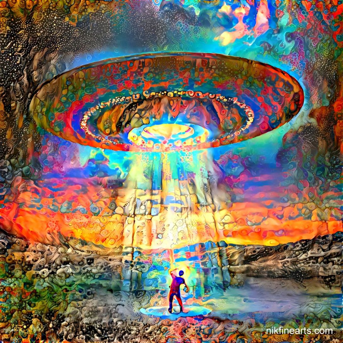 UFO – ALIENS COMING WITH FLYING SAUCER, Acrylic on canvas 32”x32”