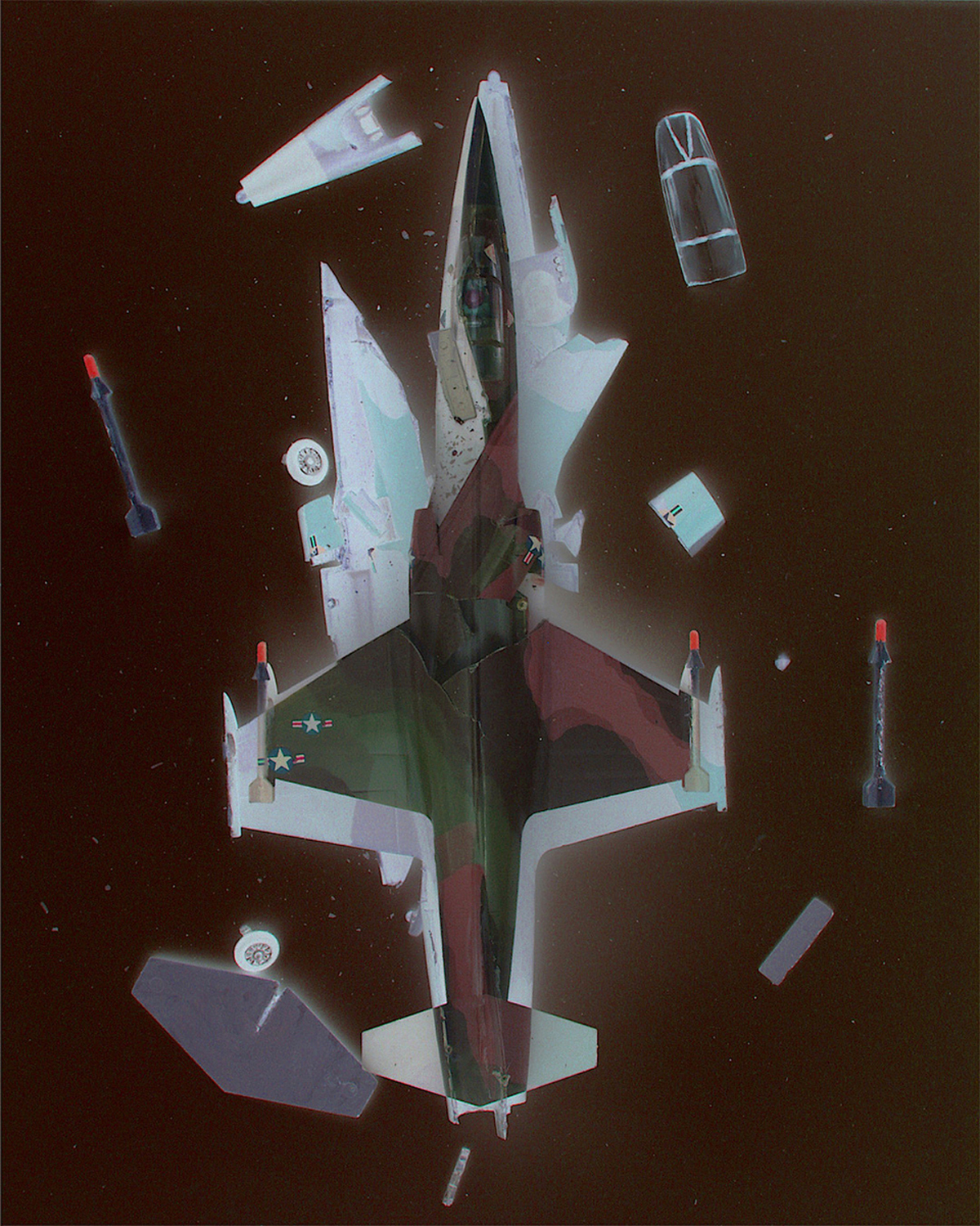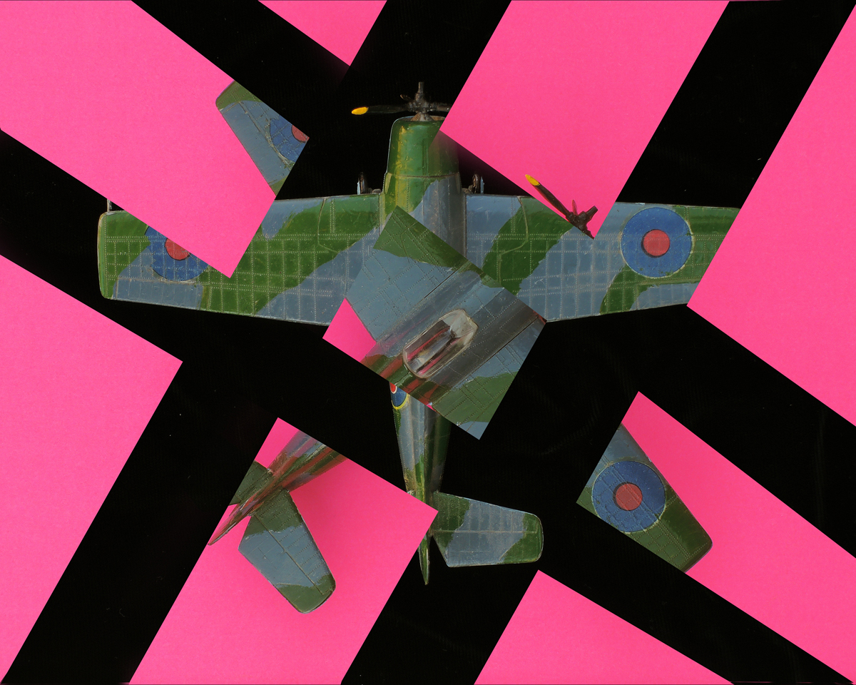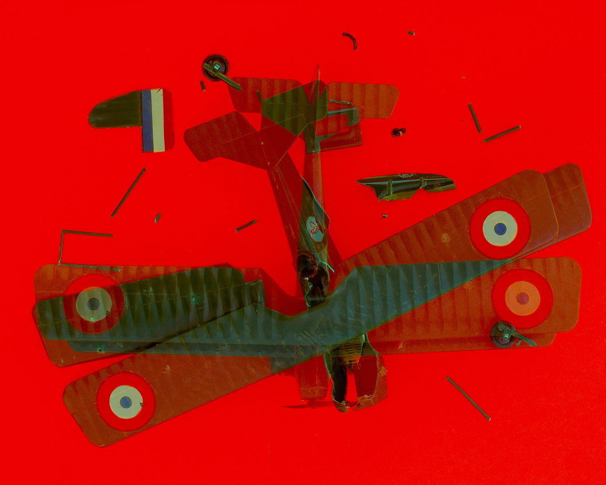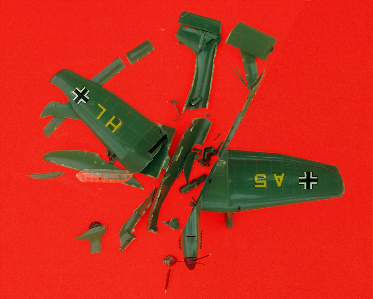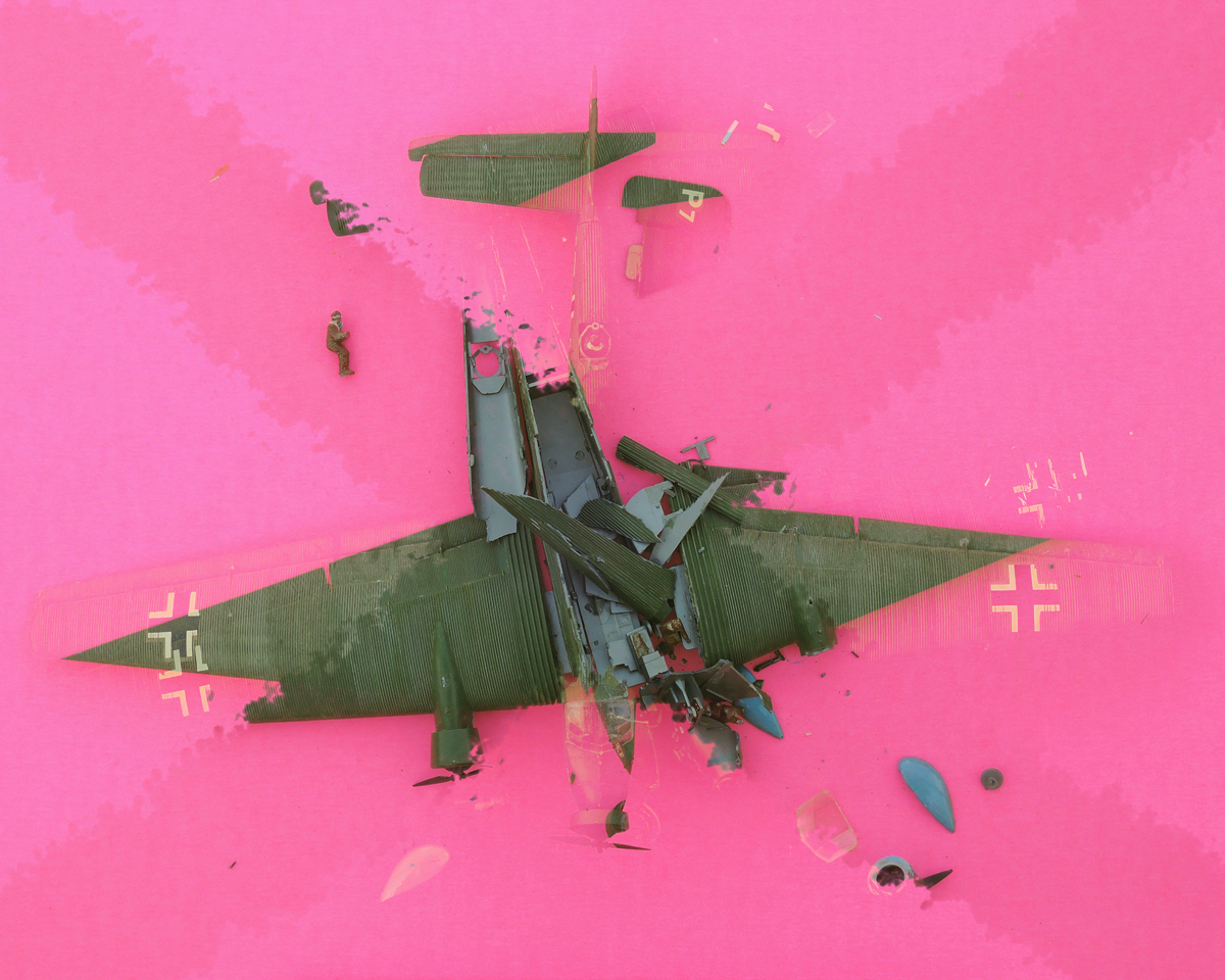 Growing up in the San Fernando Valley in the 1960’s the idea of Art was reduced to what I saw on television. I had no idea of what was happening over the Sepulveda pass in greater Los Angeles or New York City and beyond. My artistic outlet was making plastic models and painting them. For the Smash-up/Mash-up/Cut-up series of work I photograph those plastic models I made as a child, on poster board in bright day-glo colors. The colors are selected to contrast with the models and also to evoke the promise and freshness of childhood. I then smash and rephotograph them. Afterwards I sometimes combine the before and after photographs, other times I just use the smashed ones. “Bre’guet 14 Mash-up” has combined images causing your eye to question what is foreground and what is background. “Arado Flash” presents the model as a Smash-up with the bright background beginning to decay underneath the plane. More recently I have cut away portions of the photographs to reveal what is underneath the top image. An example of a Cut-up is “Stuka Cut-up” where the right third of the work is stable and the left two thirds are falling apart. This creates a sense of movement in the photograph. With this destruction of childhood achievement, I am bidding goodbye to that bright promise of childhood. Smashing my past and letting go of my childhood. This deconstruction of childhood illusions results in works using chance and the juxtaposition of contrasting colors that suggest depth to create new art. Evoking something bright and shining from the past though now broken and flawed.
