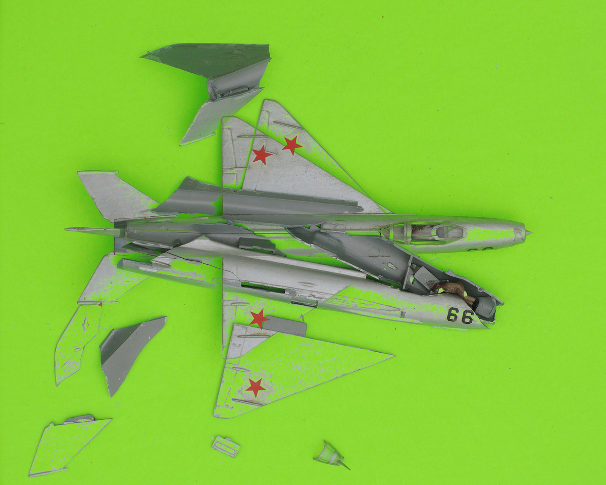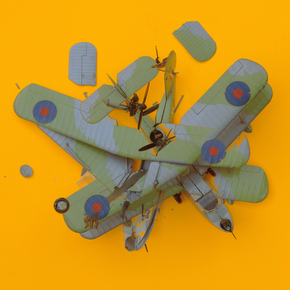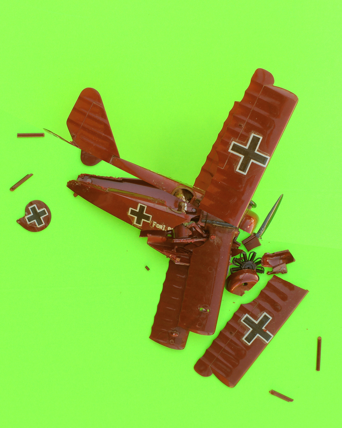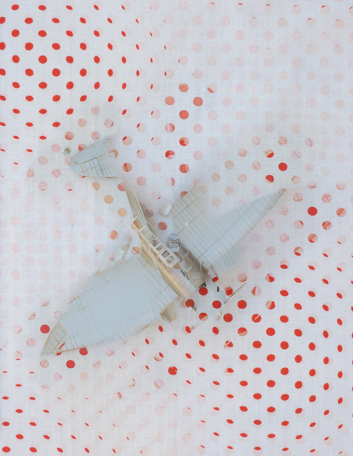 Growing up in the San Fernando Valley in the 1960’s the idea of Art was reduced to what I saw on television. I had no idea of what was happening over the Sepulveda pass in greater Los Angeles or New York City and beyond. My artistic outlet was making plastic models and painting them. For the Smash-up/Mash-up/Cut-up series of work I photograph those plastic models I made as a child, on poster board in bright day-glo colors. The colors are selected to contrast with the models and also to evoke the promise and freshness of childhood. I then smash and rephotograph them. Afterwards I sometimes combine the before and after photographs, other times I just use the smashed ones. “Bre’guet 14 Mash-up” has combined images causing your eye to question what is foreground and what is background. “Arado Flash” presents the model as a Smash-up with the bright background beginning to decay underneath the plane. More recently I have cut away portions of the photographs to reveal what is underneath the top image. An example of a Cut-up is “Stuka Cut-up” where the right third of the work is stable and the left two thirds are falling apart. This creates a sense of movement in the photograph. With this destruction of childhood achievement, I am bidding goodbye to that bright promise of childhood. Smashing my past and letting go of my childhood. This deconstruction of childhood illusions results in works using chance and the juxtaposition of contrasting colors that suggest depth to create new art. Evoking something bright and shining from the past though now broken and flawed.