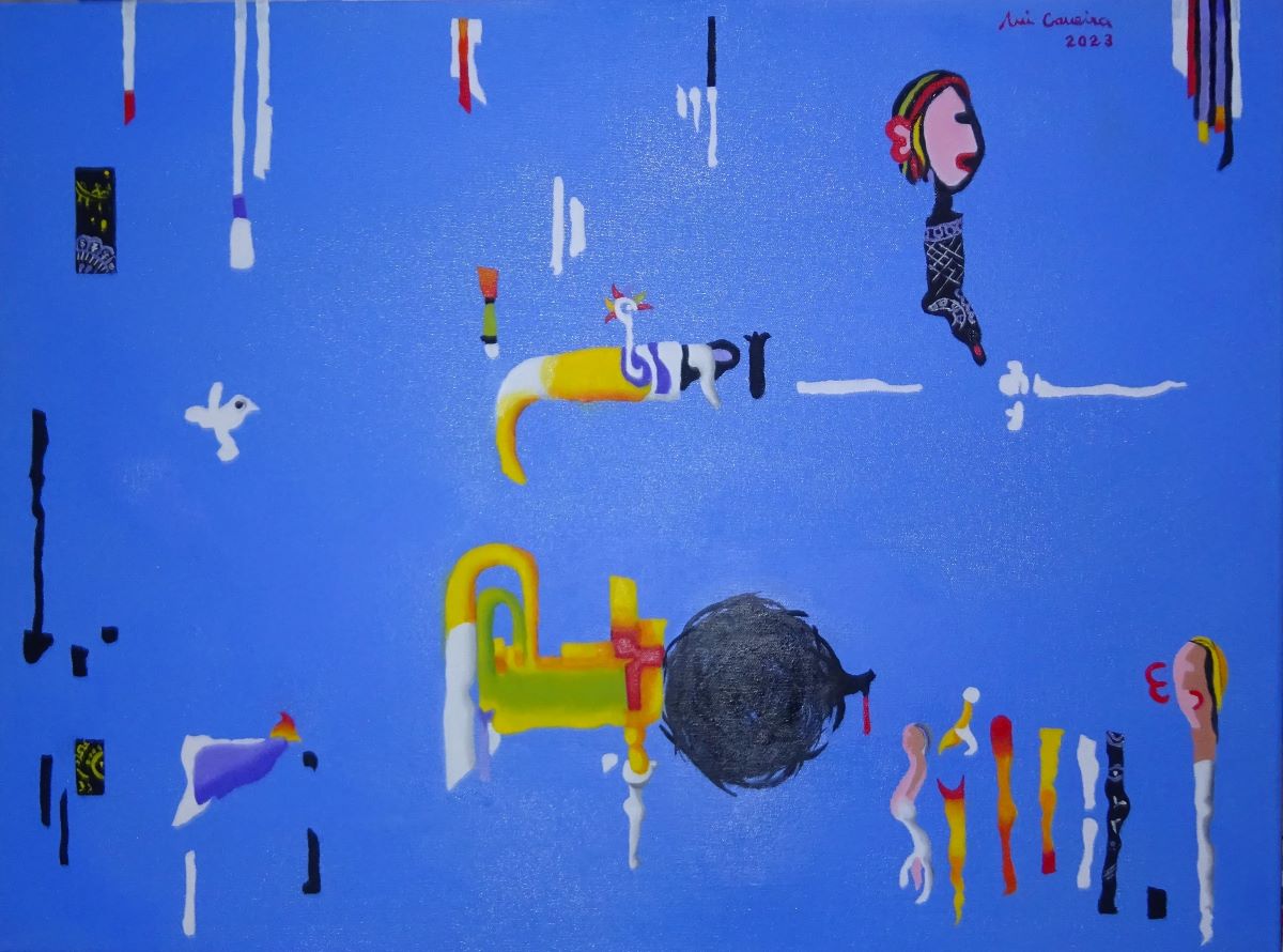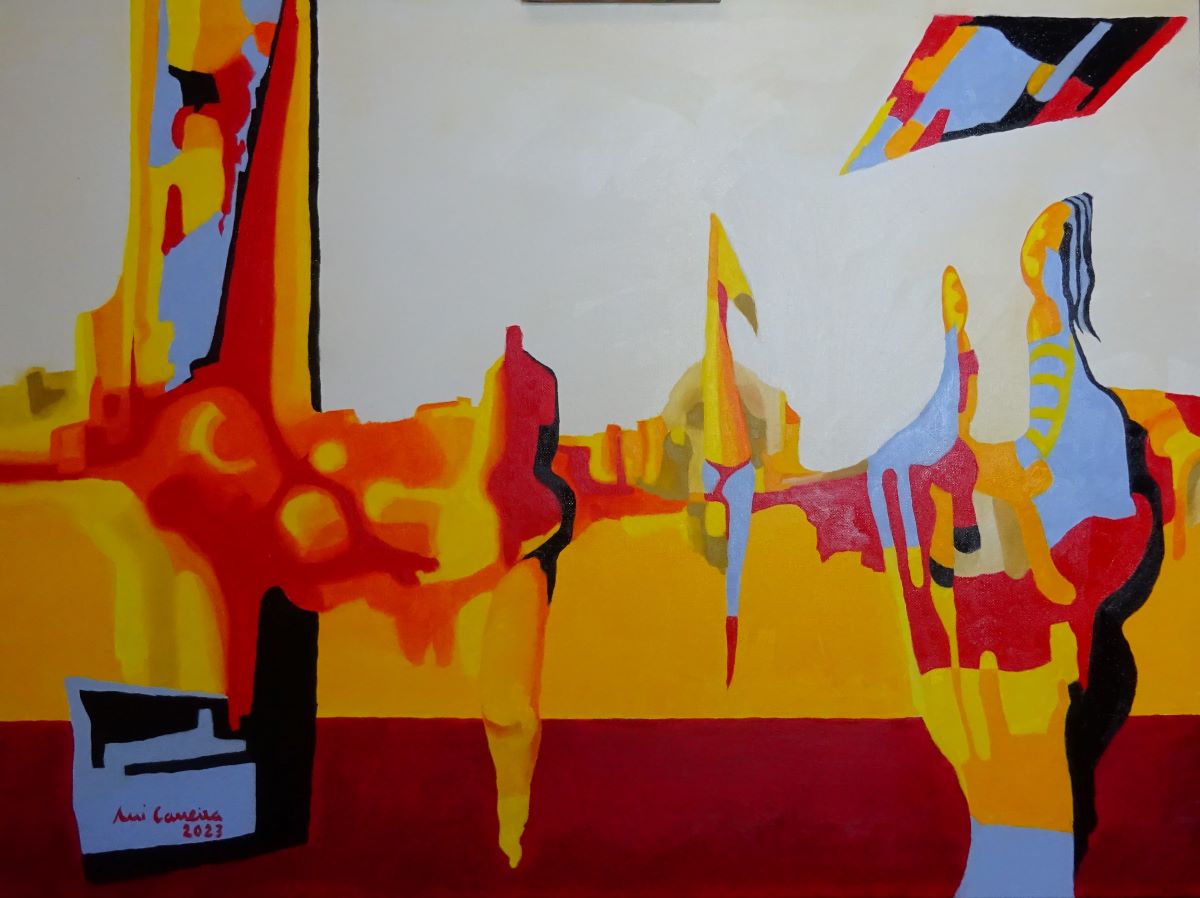 Rui’s work stands out for its use of very vivid yellows, blues, greens and reds in an imaginary world circumscribed and created by himself. The scenes and figures depicted create comic, critical or more realistic feelings and sometimes the viewer may think that the painting is a “comic book”. “Reinventing himself” is also one of his “brand images”: “Daring to take risks” is the challenge, creating a style is easy. He has passed through monochrome Abstractionism, Surrealism, Realism and other Phases. At the moment, he’s in Abstractionism. He always sees painting as a challenge and with honesty.