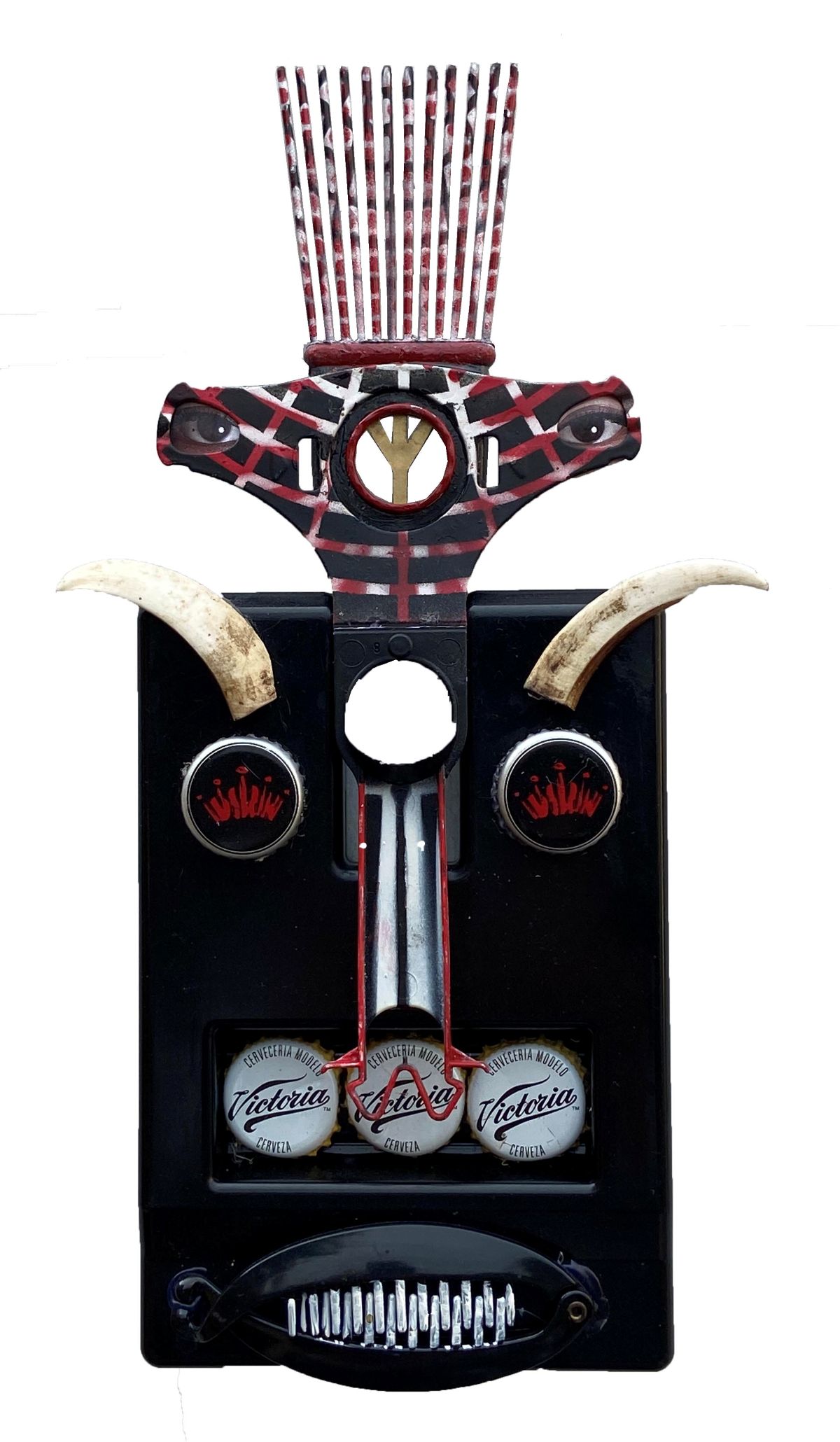 I am a self-taught artist. For the past 20 years I have worked with found objects to create sculptures, assemblages, figures, masks and collages. I aim to stimulate the viewer’s