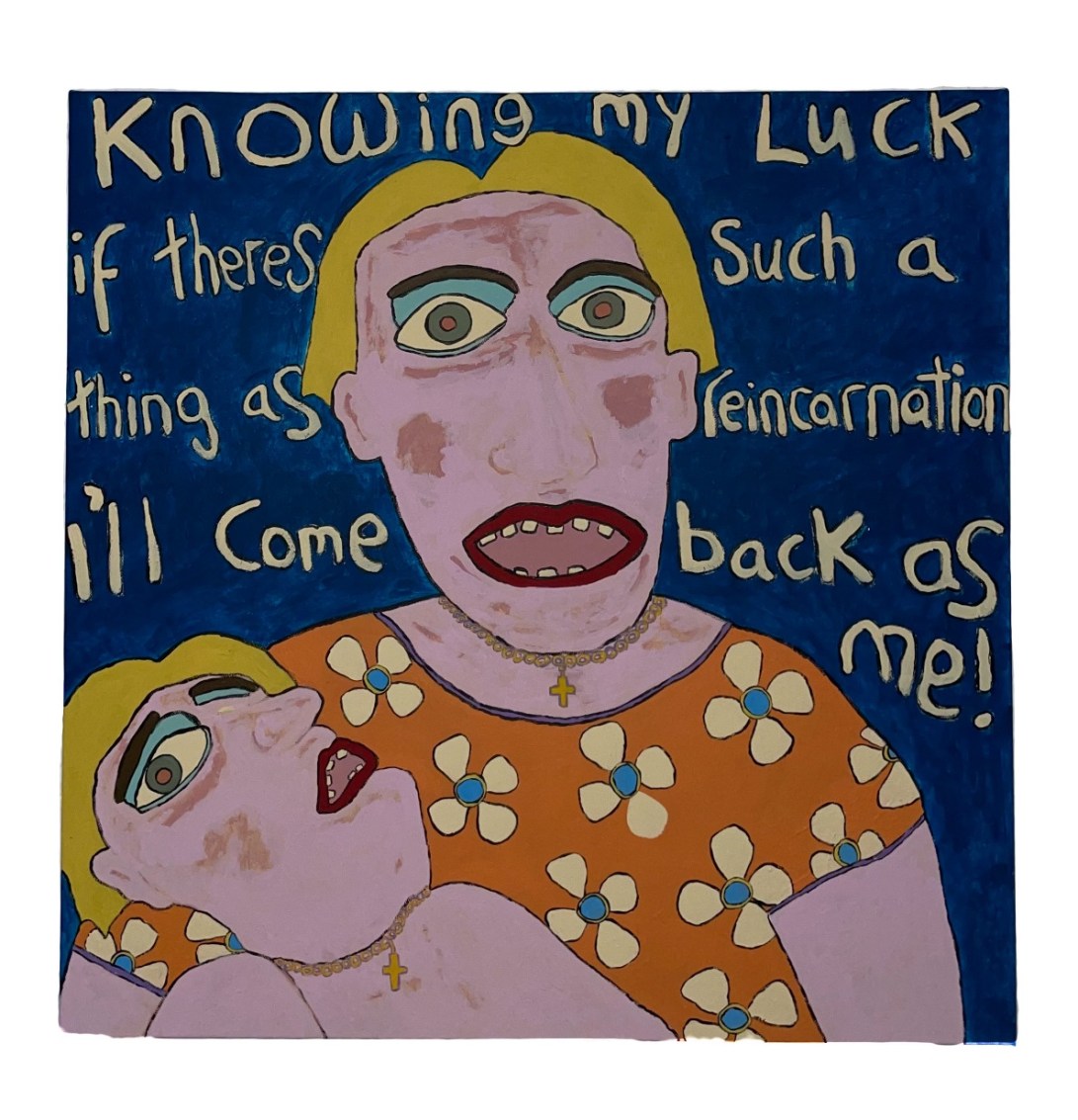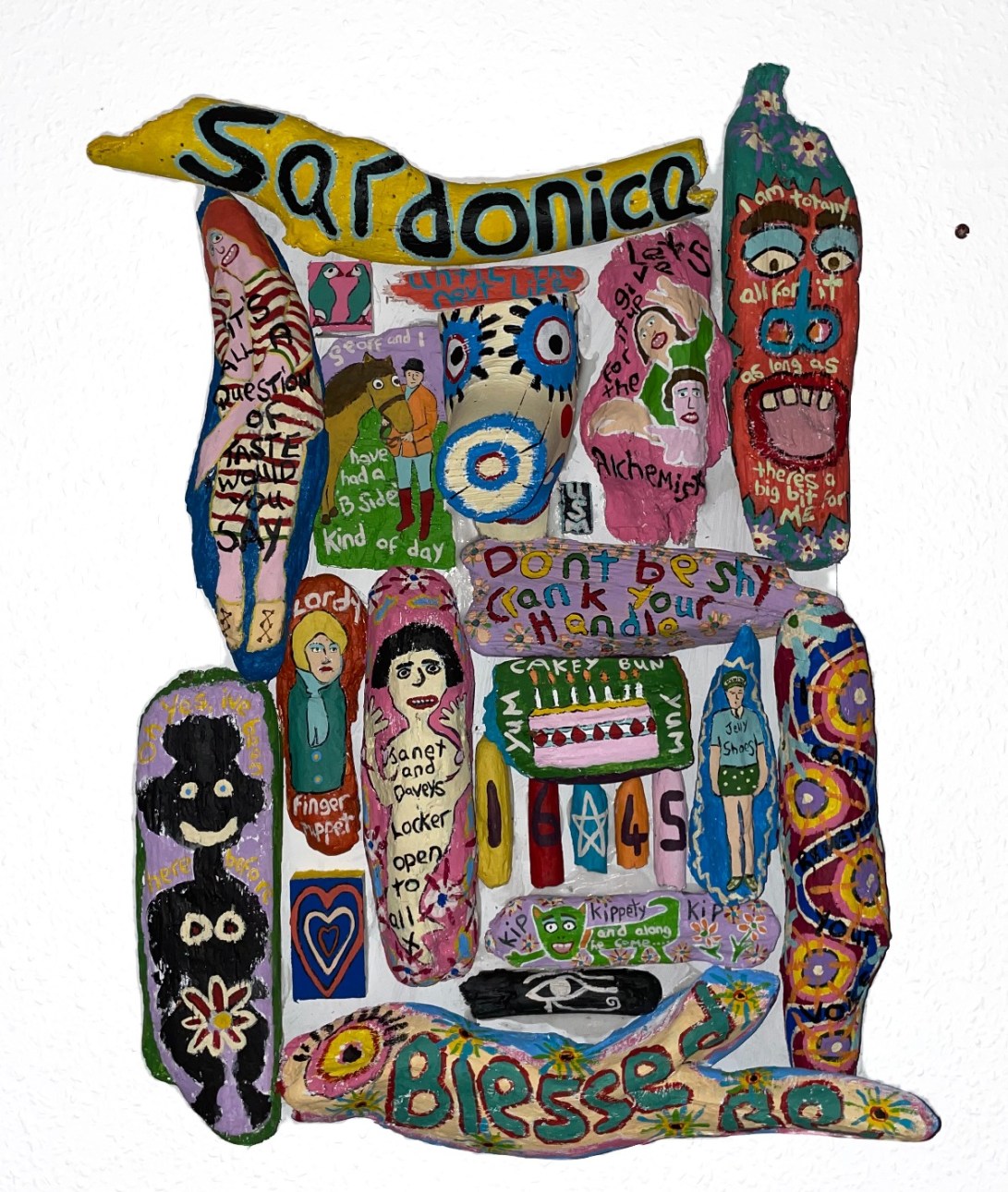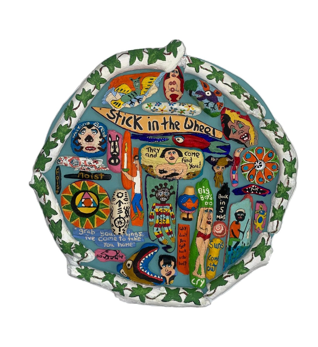 In the main, I create all my pictures with found objects from the beach. The paintings are on reclaimed, secondhand canvasses. I build the pictures up with tester pot paints, found and given old paints that would generally end up in the skip! The themes, captions and images are like a running commentary of life past and present, documenting old sayings, lyrics, quotes and proverbs that have left some indelible mark!