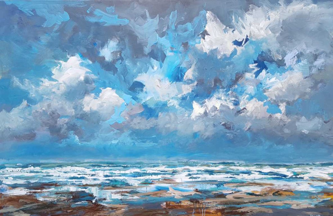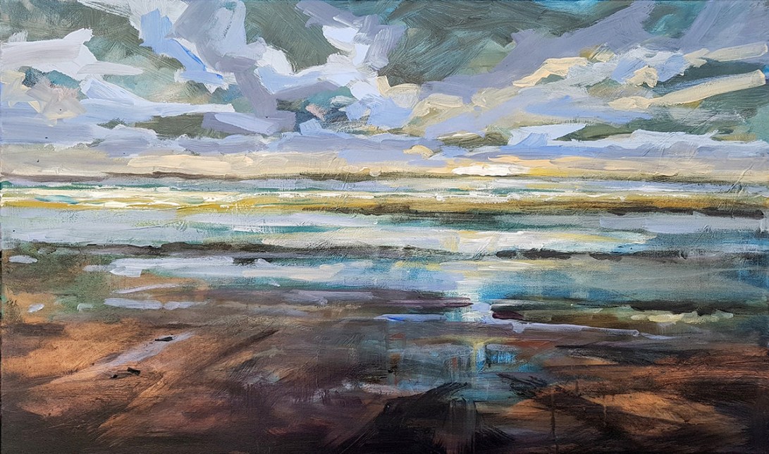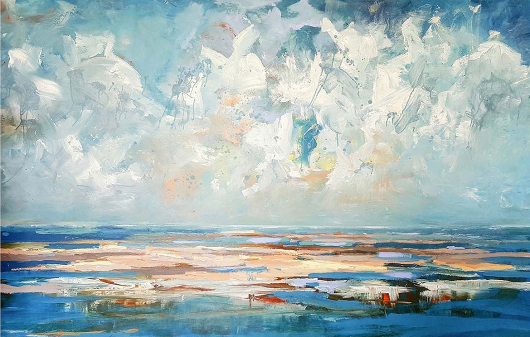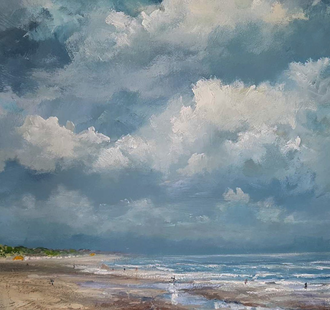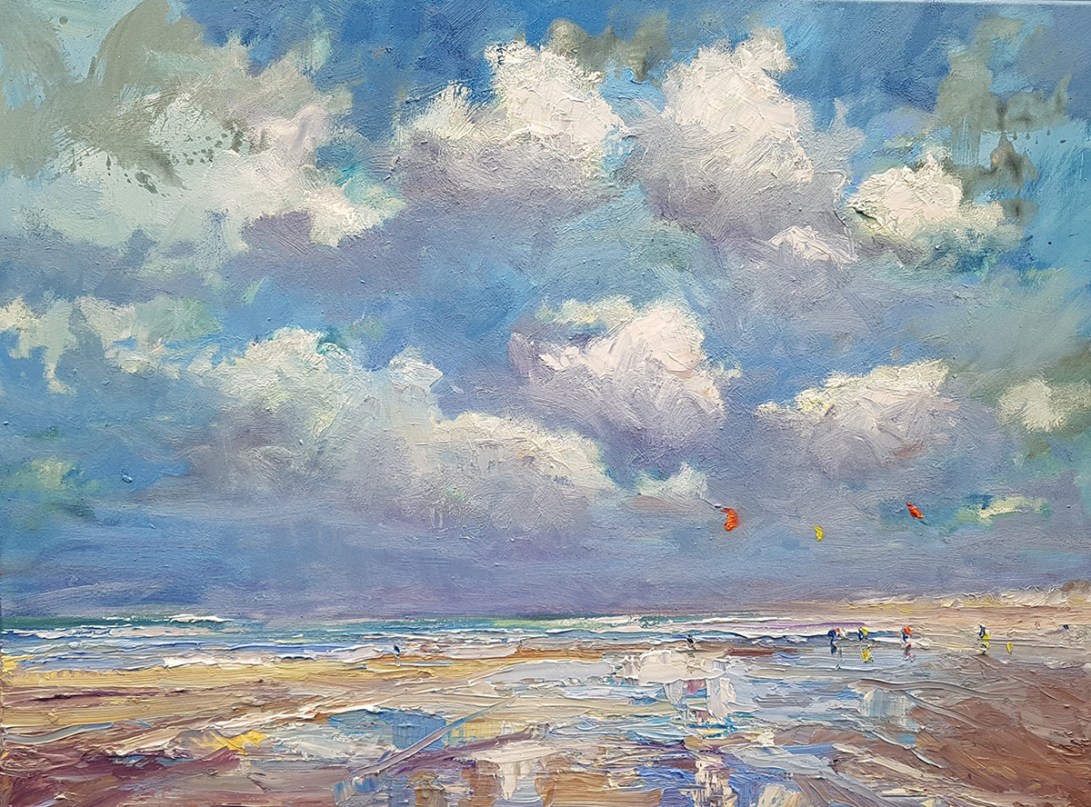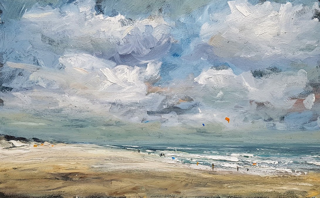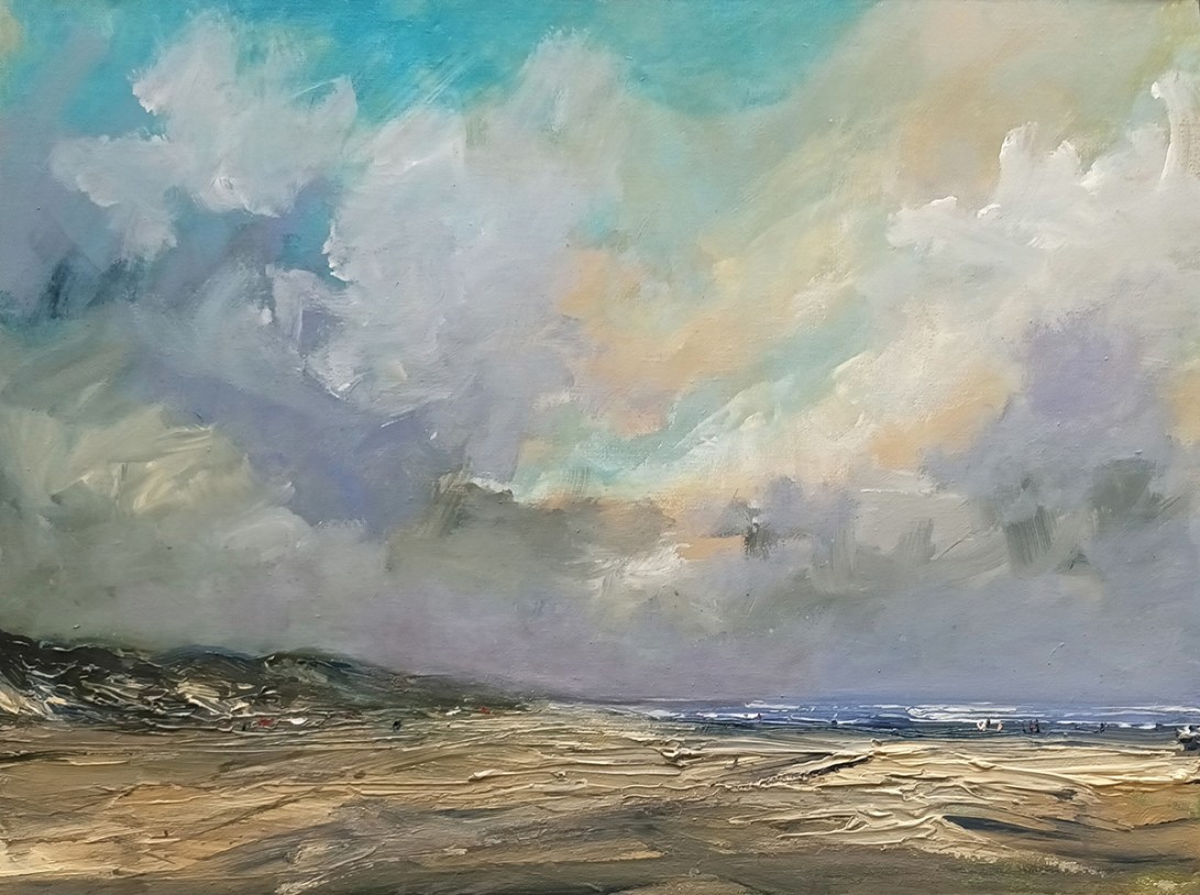 After my conservatory diploma I went to study at Willem de Kooning Academy in Rotterdam where I was immersed in modern art. There I learned a lot about the subject of modern art society. This is then portrayed by the artist in a unique and sometimes innovative way, often rejecting the traditional values of the artist’s critical attitude, becoming visible in a work of art as a creative and visual manifesto. I noticed that modern art triggered me on the one hand, but on the other I felt attracted by the beautiful and fascinating nature. I always continued to do plein air painting and I experience more than in my studio, the freedom during the process of creating and painting. The landscapes I paint mean a lot to me. This often has to do with the mood in which I am. Many paintings show a lot of sky, this to give a stage to the magnificent exciting cloudy skies, which change from minute to minute. The atmosphere is perhaps the most important element of the artwork for me. If the art viewer experiences the atmosphere and enjoys the landscape, then I have been able to pass on my message.